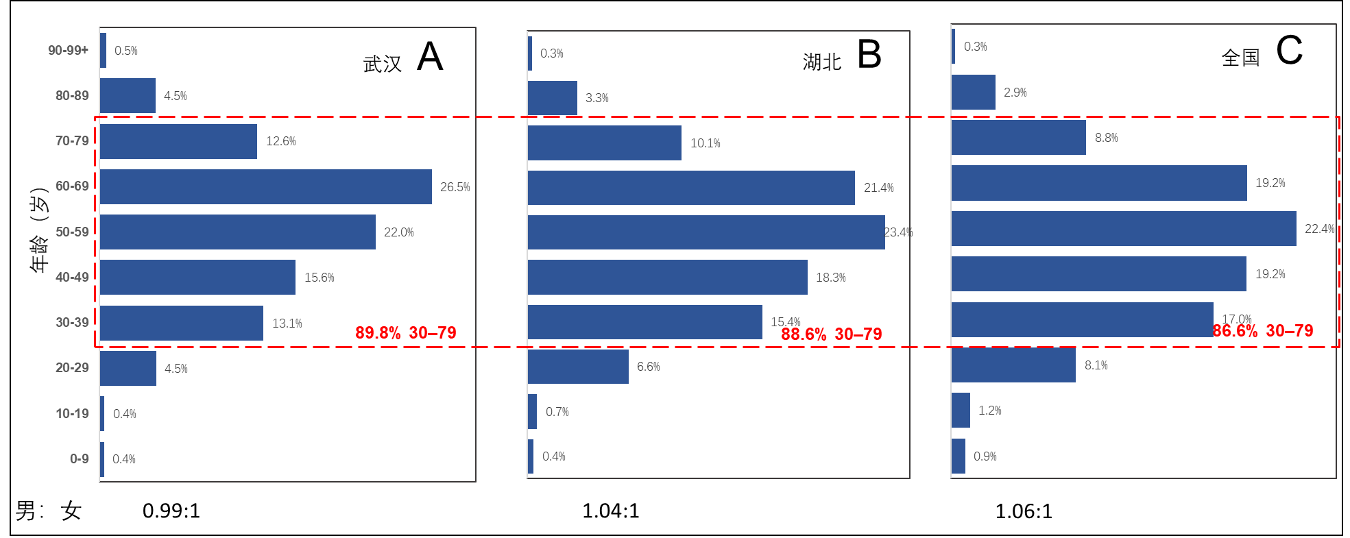 對確診病例(N = 44672)的特征進行分析發(fā)現(xiàn),病人集中在30-79歲,該年齡組占確診病例總數(shù)比例武漢市為89.8%,湖北省(包括武漢)為88.6%,全國(包括湖北)為86.6%。60歲以上的老年組病例數(shù)占比,武漢為44.1%,湖北(包括武漢)為35.1%,全國(包括湖北)為31.2%(圖3)。確診病例男女比例武漢為0.99:1,湖北為1.04:1,全國為1.06:1,農(nóng)民或工人占22.0%,湖北省占74.7%,81.0%屬于輕/中癥(表1)。