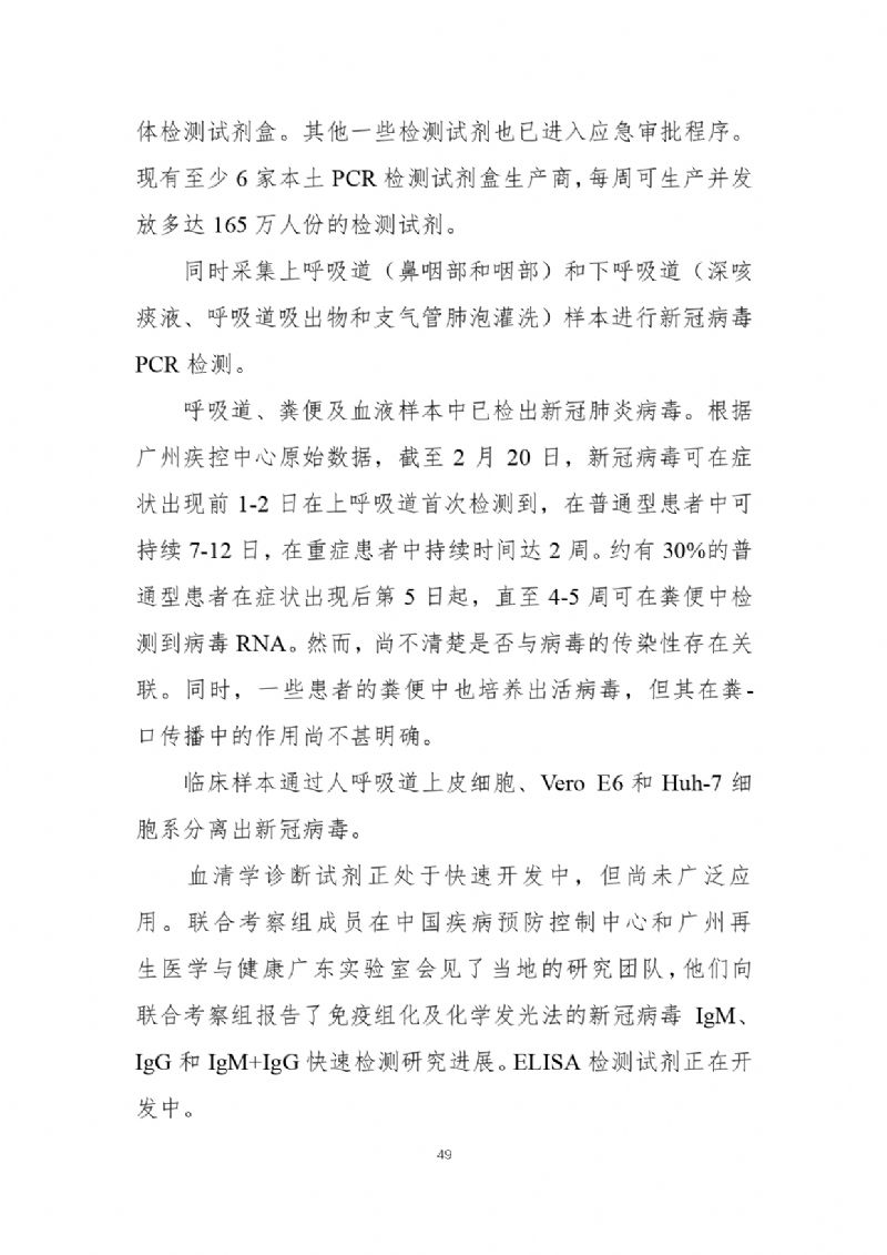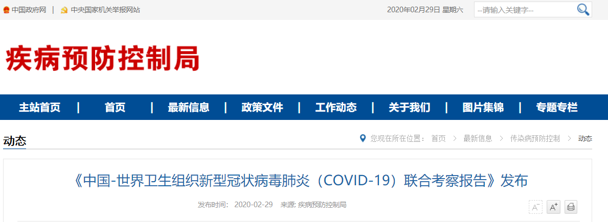 2月29日,國(guó)家疾病預(yù)防控制局發(fā)布《中國(guó)-世界衛(wèi)生組織新型冠狀病毒肺炎(COVID-19)聯(lián)合考察報(bào)告》,對(duì)重視問(wèn)題、主要發(fā)現(xiàn)、中國(guó)和全球應(yīng)對(duì)措施及下一步工作進(jìn)行了闡述,并且公布了部分實(shí)驗(yàn)室檢驗(yàn)、診斷與病毒學(xué)、研發(fā)等方面詳細(xì)的技術(shù)調(diào)查結(jié)果。