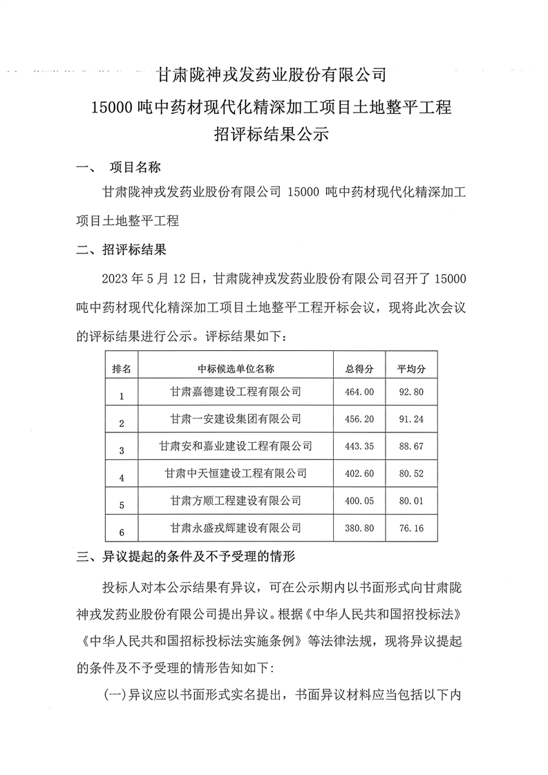 甘肅隴神戎發(fā)藥業(yè)股份有限公司15000噸中藥材現(xiàn)代化精深加工項(xiàng)目土地整平工程招評標(biāo)結(jié)果公示