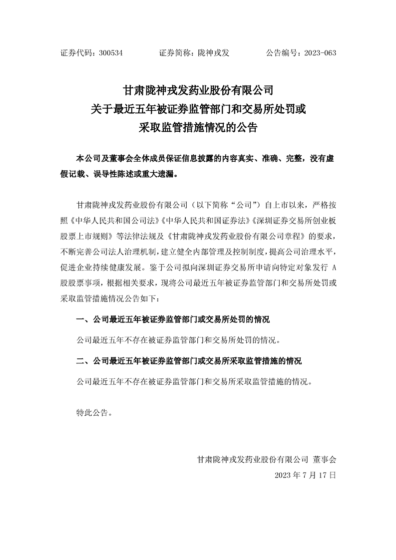 關(guān)于最近五年被證券監(jiān)管部門(mén)和交易所處罰或采取監(jiān)管措施情況的公告