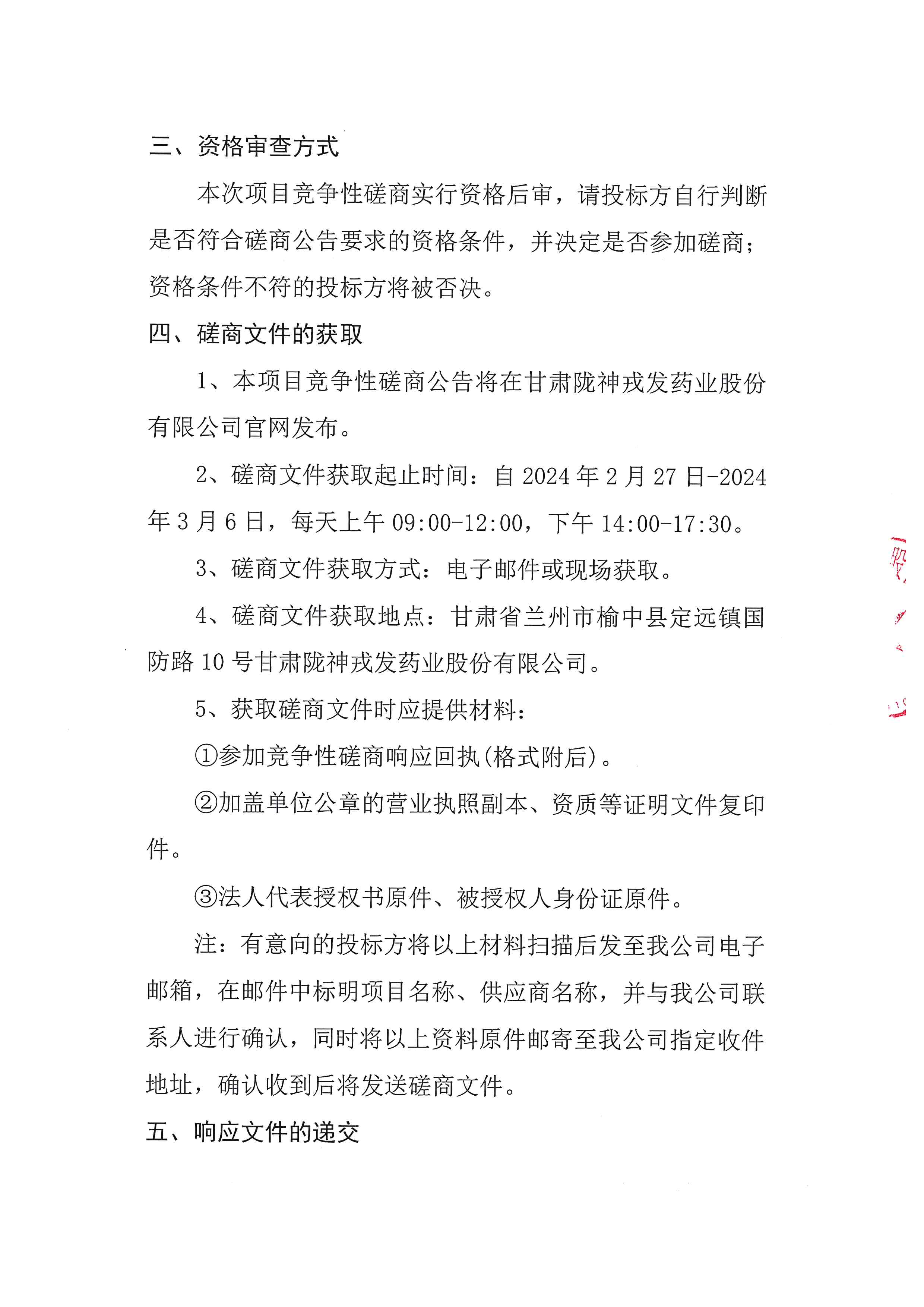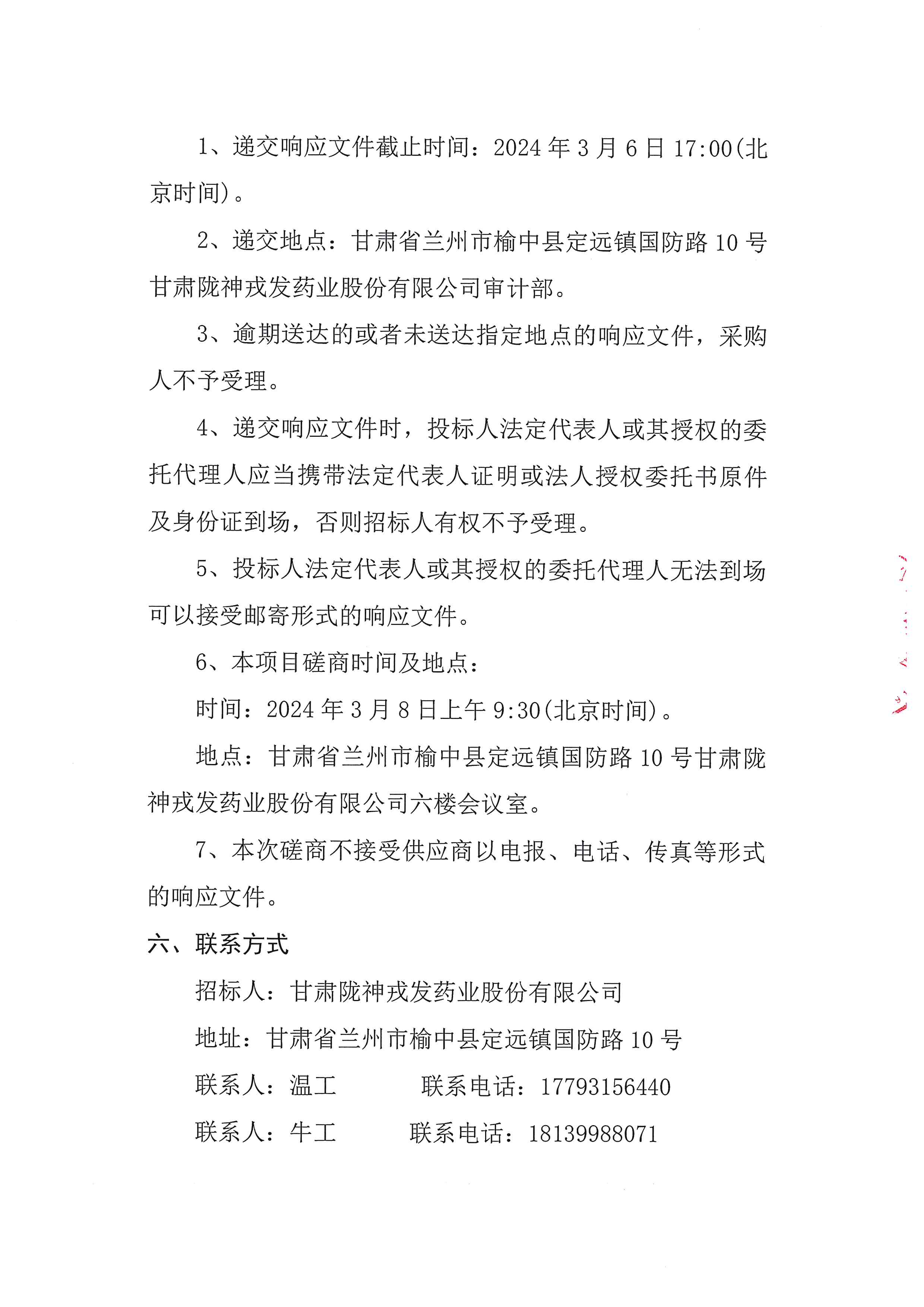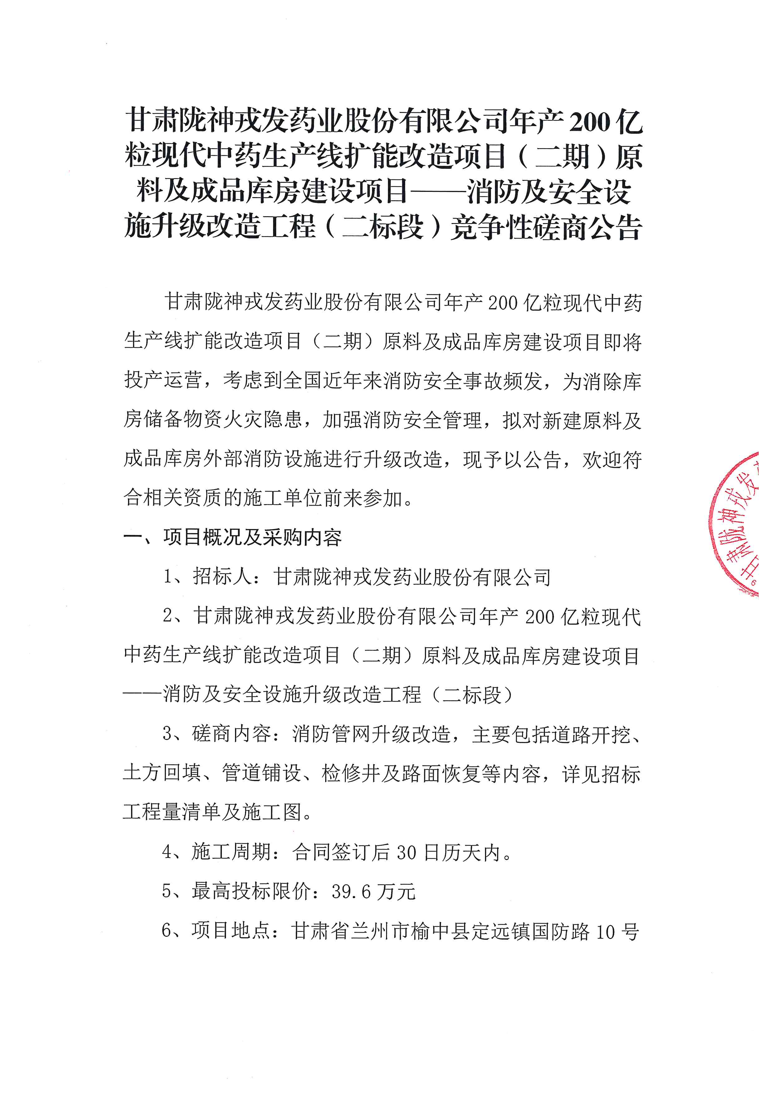 甘肅隴神戎發(fā)藥業(yè)股份有限公司年產(chǎn)200億粒現(xiàn)代中藥生產(chǎn)線擴(kuò)能改造項(xiàng)目(二期)原料及成品庫房建設(shè)項(xiàng)目——消防及安全設(shè)施升級改造工程(二標(biāo)段)競爭性磋商公告