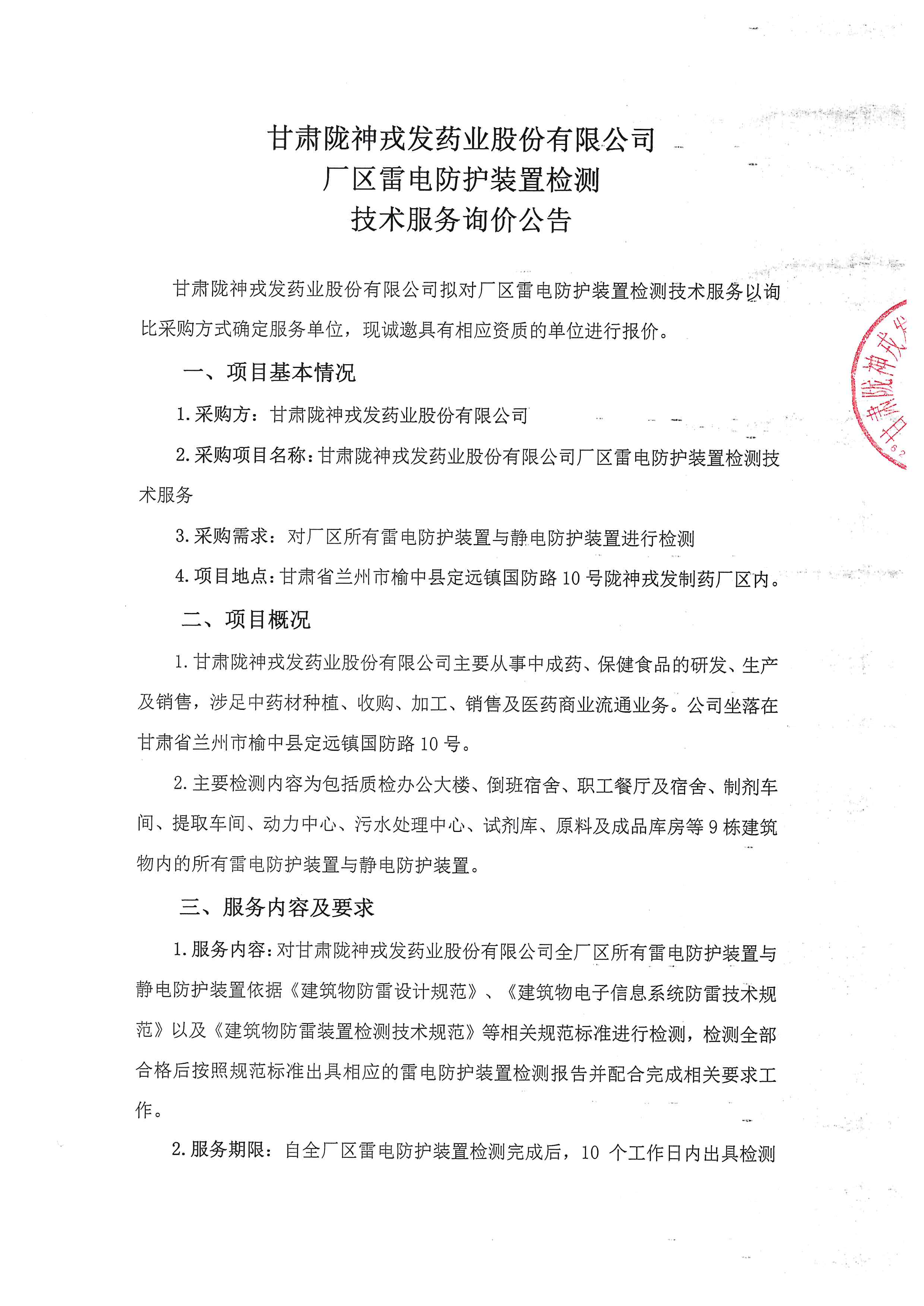 甘肅隴神戎發(fā)藥業(yè)股份有限公司廠區(qū)雷電防護(hù)裝置檢測(cè)技術(shù)服務(wù)詢價(jià)公告