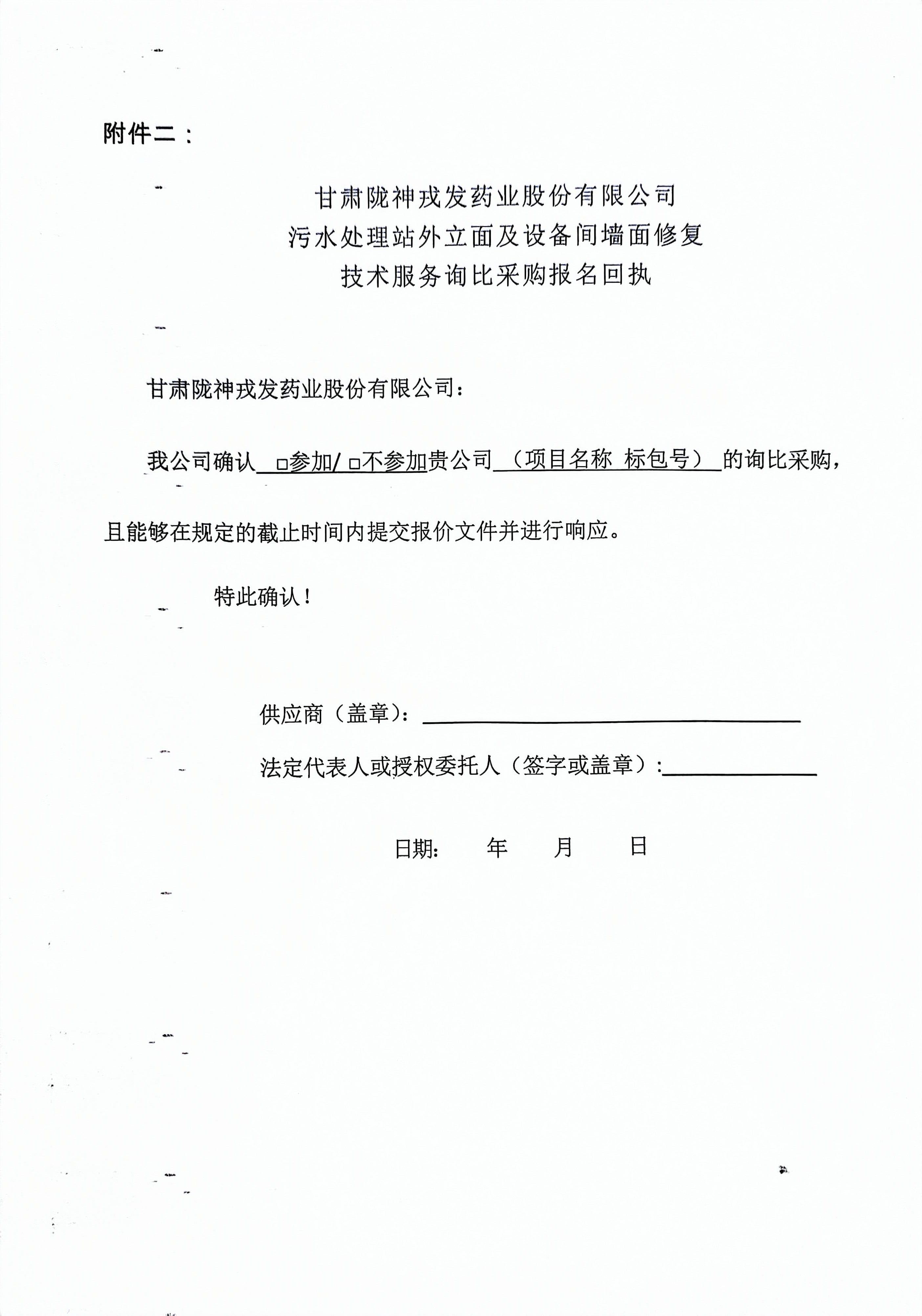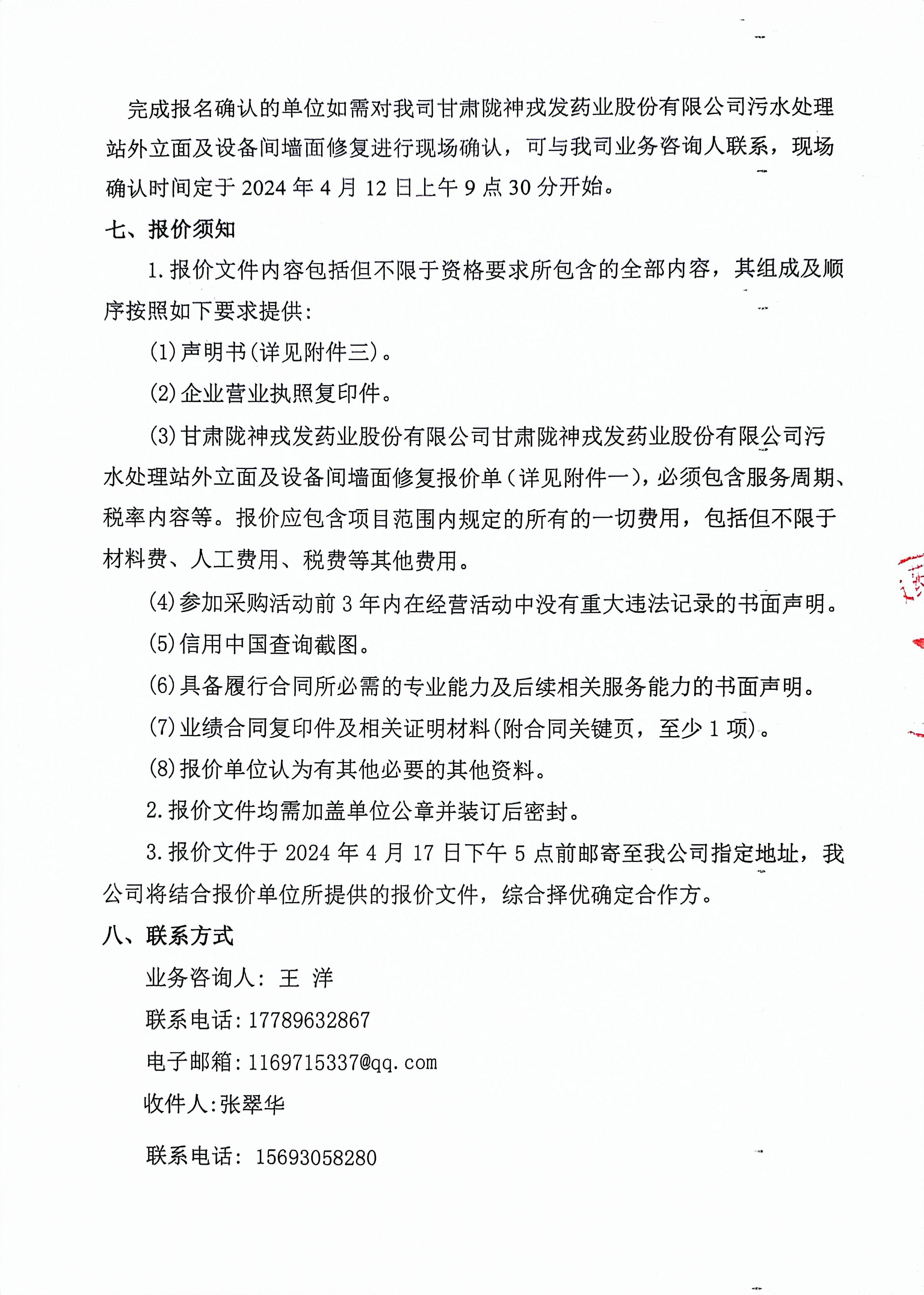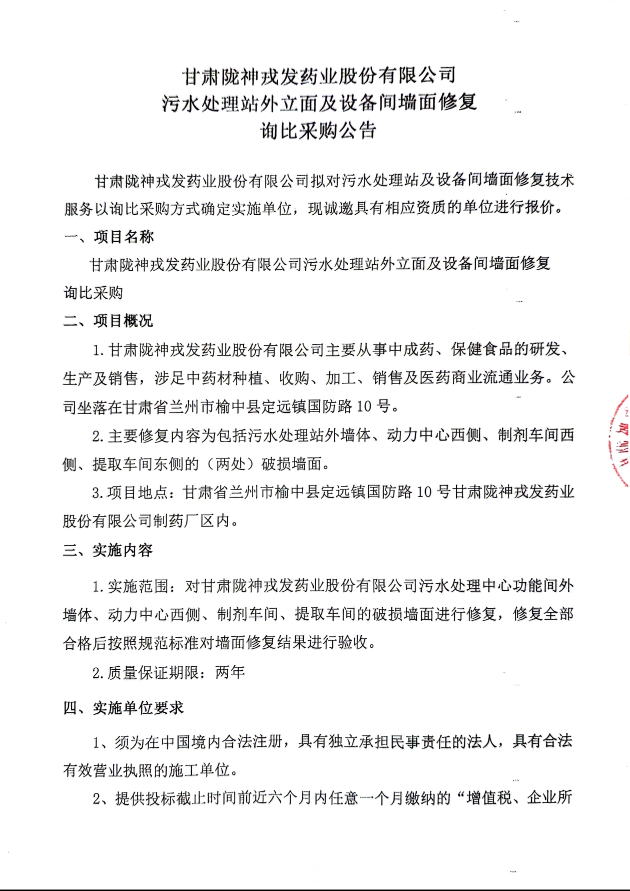 甘肅隴神戎發(fā)藥業(yè)股份有限公司污水處理站外立面及設(shè)備間墻面修復(fù)詢比采購公告