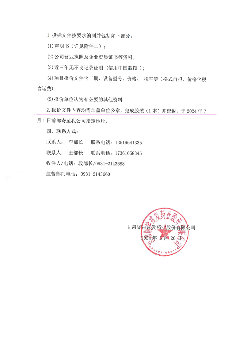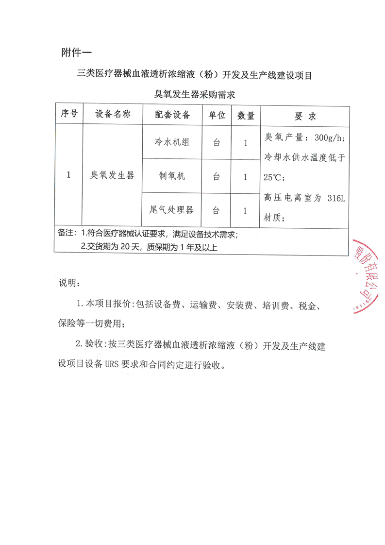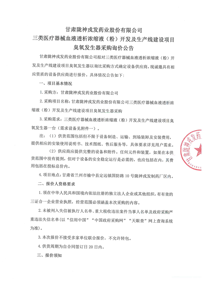 甘肅隴神戎發(fā)藥業(yè)股份有限公司三類醫(yī)療器械血液透析濃縮液(粉)開發(fā)及生產(chǎn)線建設(shè)項目臭氧發(fā)生器采購詢價公告
