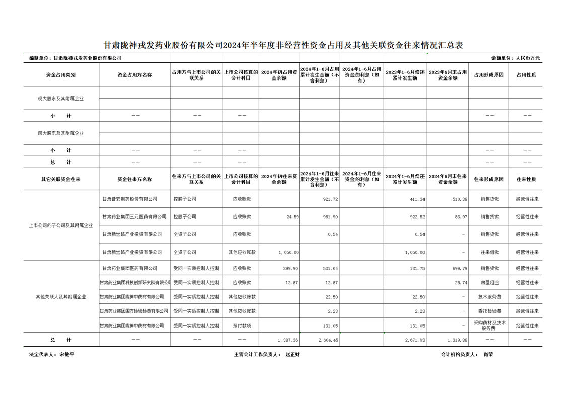 2024年半年度非經營性資金占用及其他關聯(lián)資金往來情況匯總表