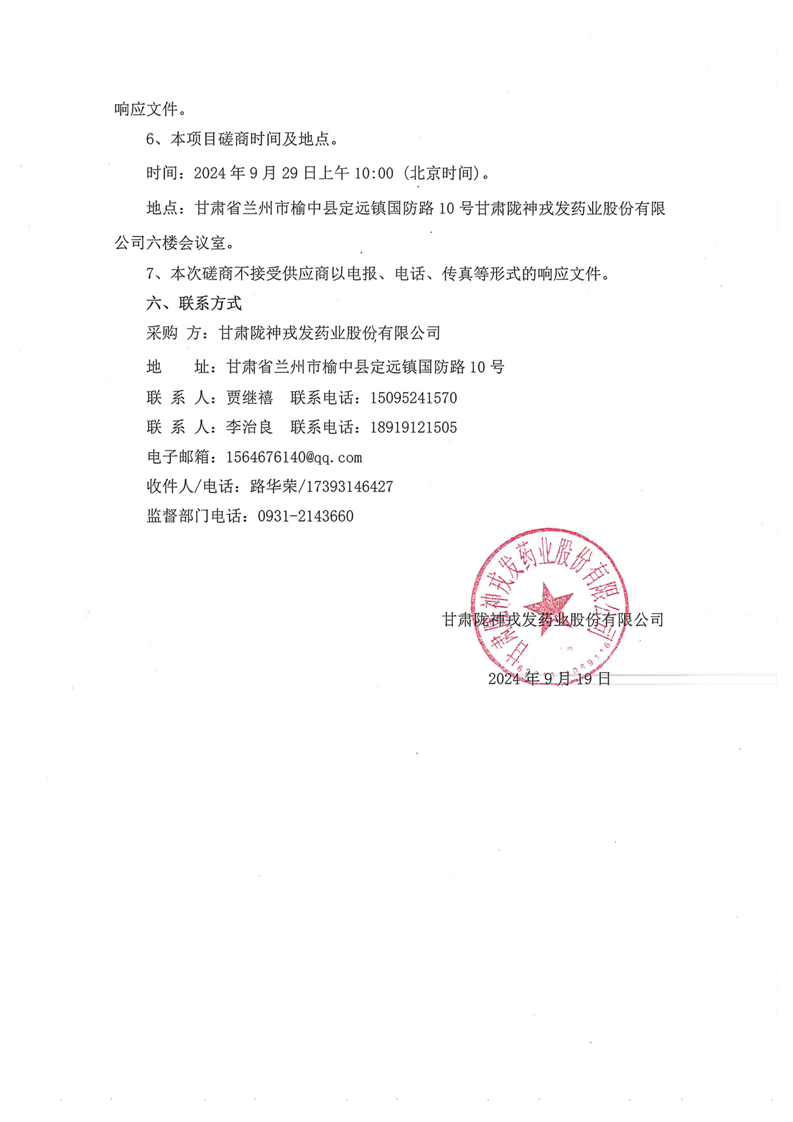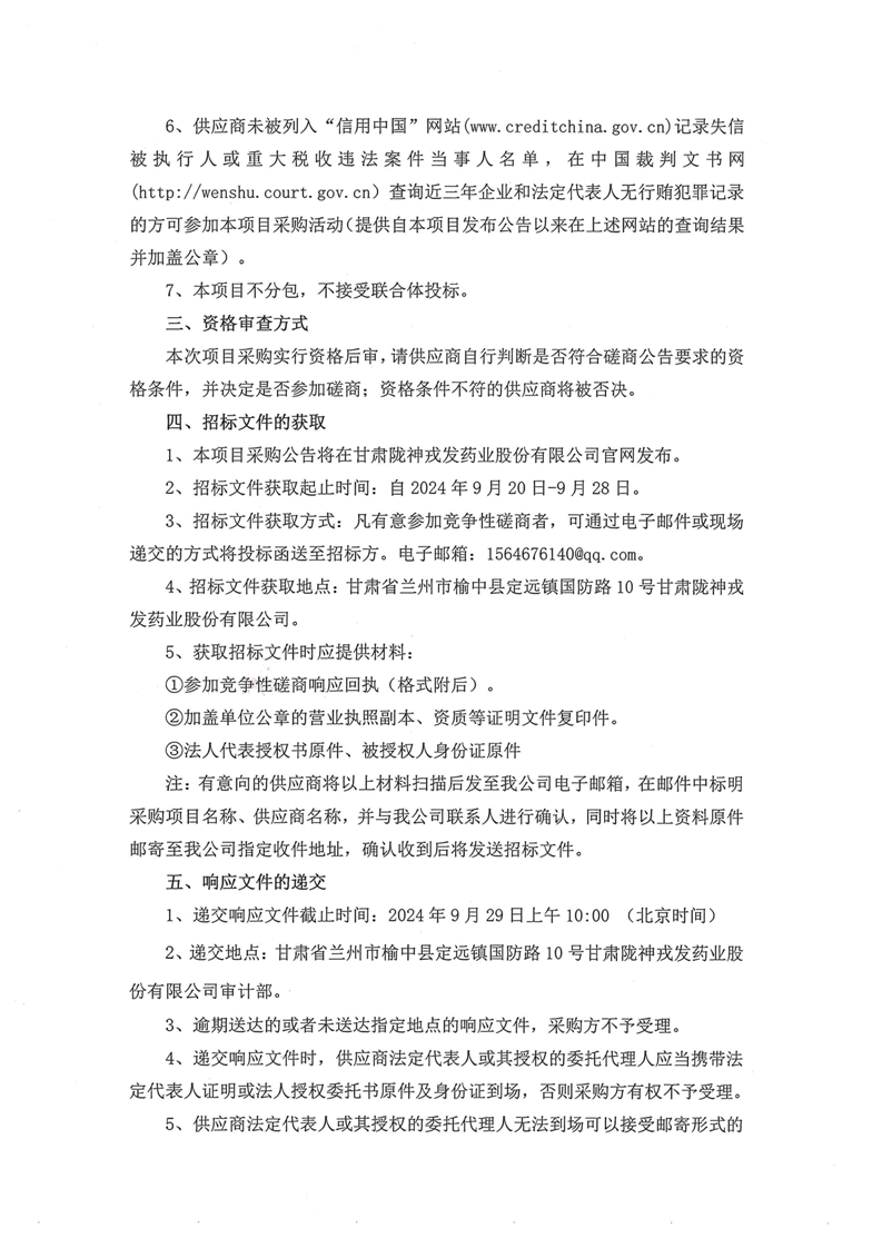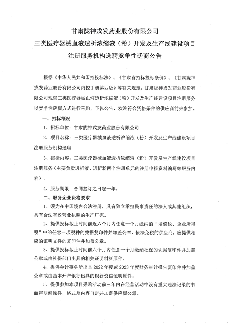甘肅隴神戎發(fā)藥業(yè)股份有限公司三類醫(yī)療器械血液透析濃縮液(粉)開發(fā)及生產(chǎn)線建設(shè)項(xiàng)目注冊服務(wù)機(jī)構(gòu)選聘競爭性磋商公告