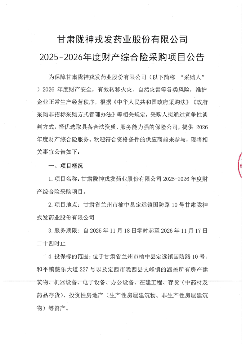 甘肅隴神戎發(fā)藥業(yè)股份有限公司2025-2026年度財(cái)產(chǎn)綜合險(xiǎn)采購項(xiàng)目公告