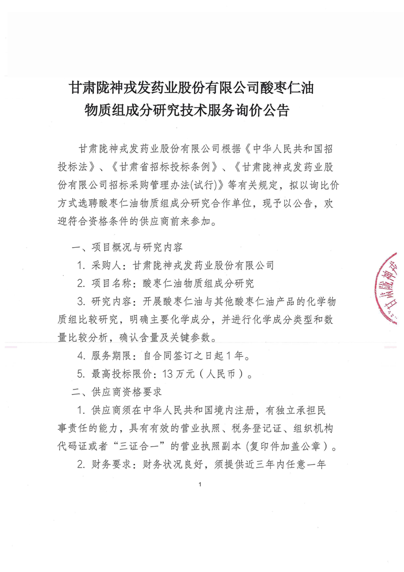 甘肅隴神戎發(fā)藥業(yè)股份有限公司酸棗仁油物質(zhì)組成分研究技術(shù)服務詢價公告