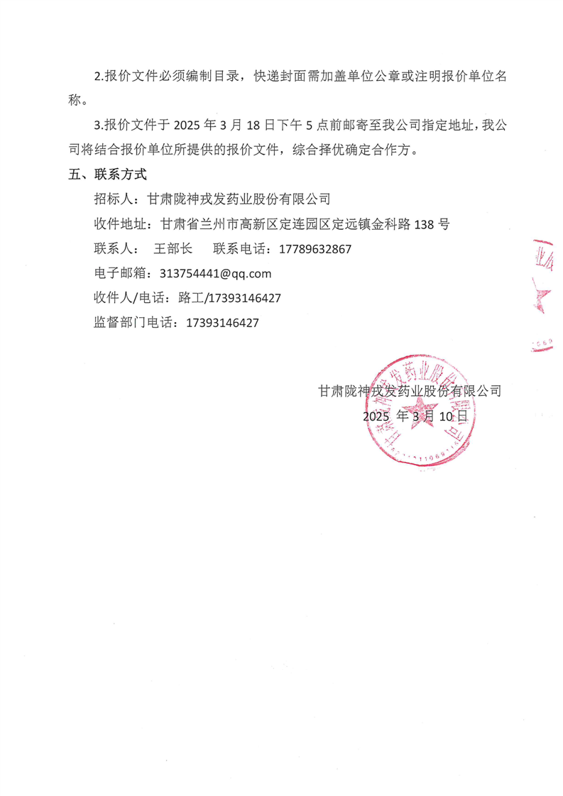 甘肅隴神戎發(fā)藥業(yè)股份有限公司廠區(qū)建筑墻面、路面維修詢比采購(gòu)公告