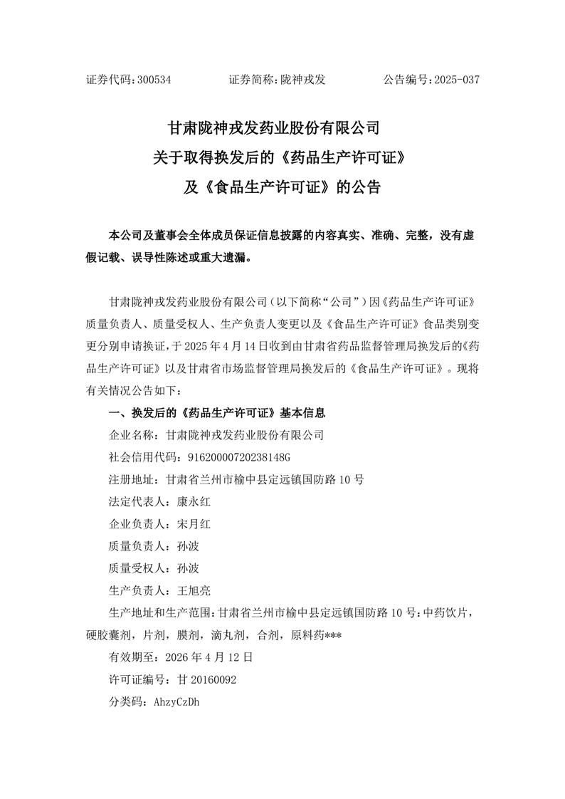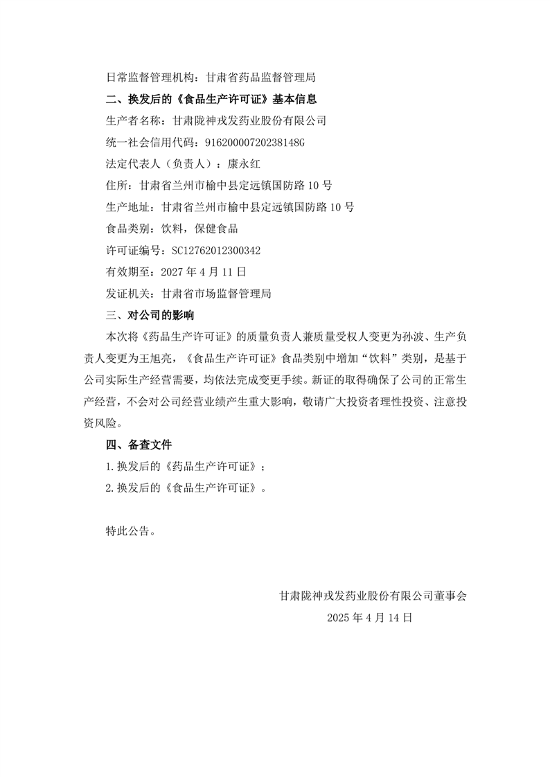 關(guān)于取得換發(fā)后的《藥品生產(chǎn)許可證》及《食品生產(chǎn)許可證》的公告