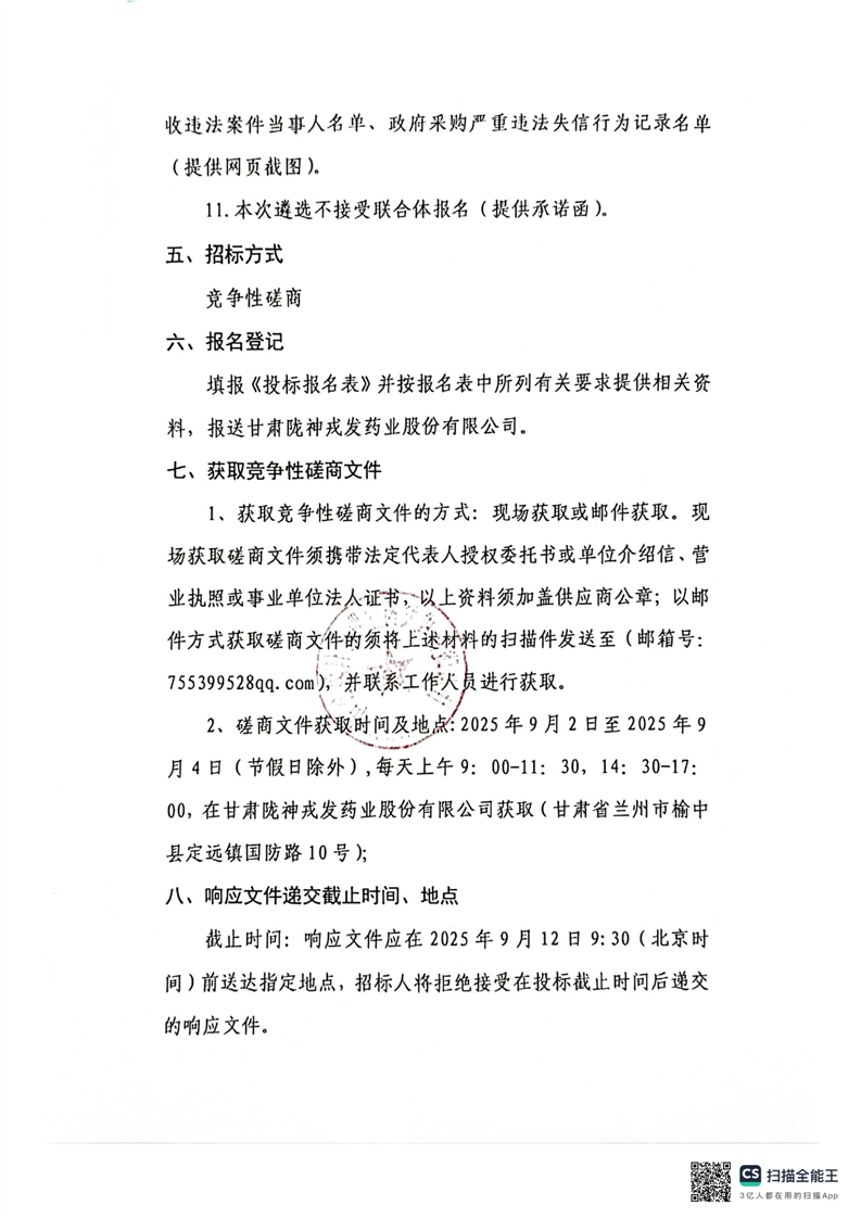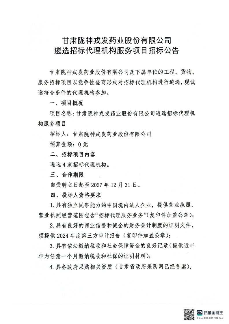 甘肅隴神戎發(fā)藥業(yè)股份有限公司遴選招標(biāo)代理機(jī)構(gòu)服務(wù)項(xiàng)目公告