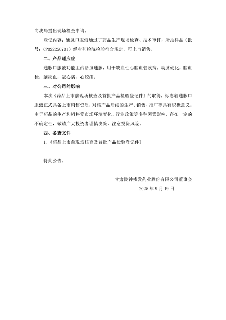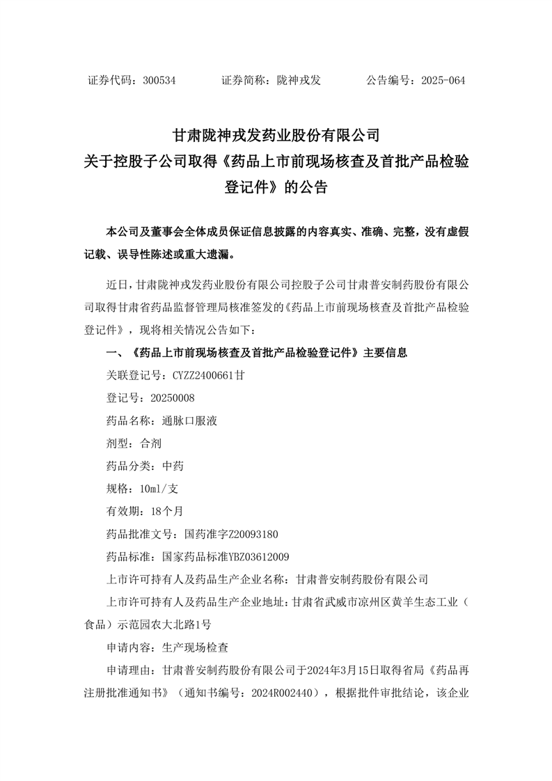 關(guān)于控股子公司取得《藥品上市前現(xiàn)場(chǎng)核查及首批產(chǎn)品檢驗(yàn)登記件》的公告