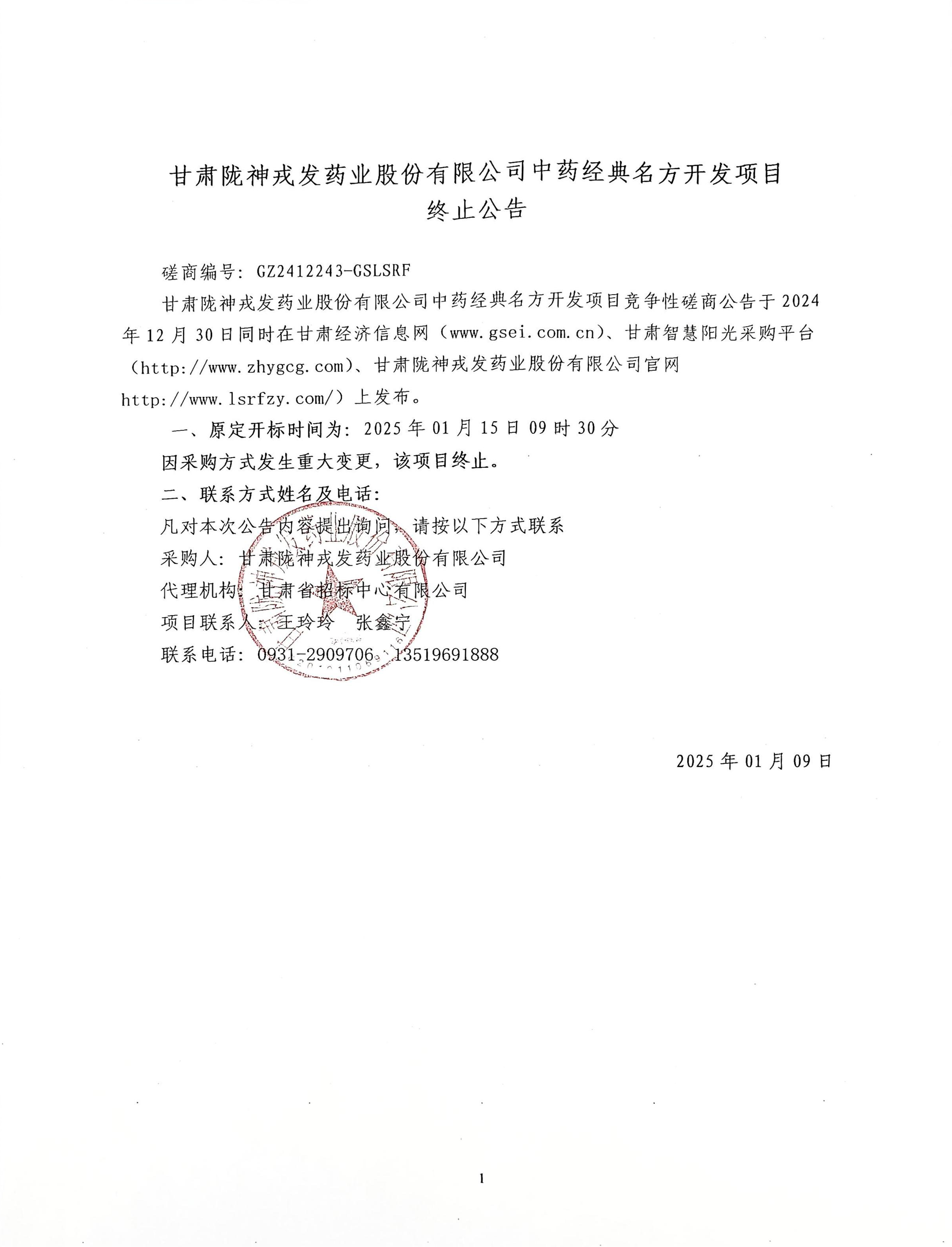甘肅隴神戎發(fā)藥業(yè)股份有限公司中藥經(jīng)典名方開發(fā)項(xiàng)目終止公告