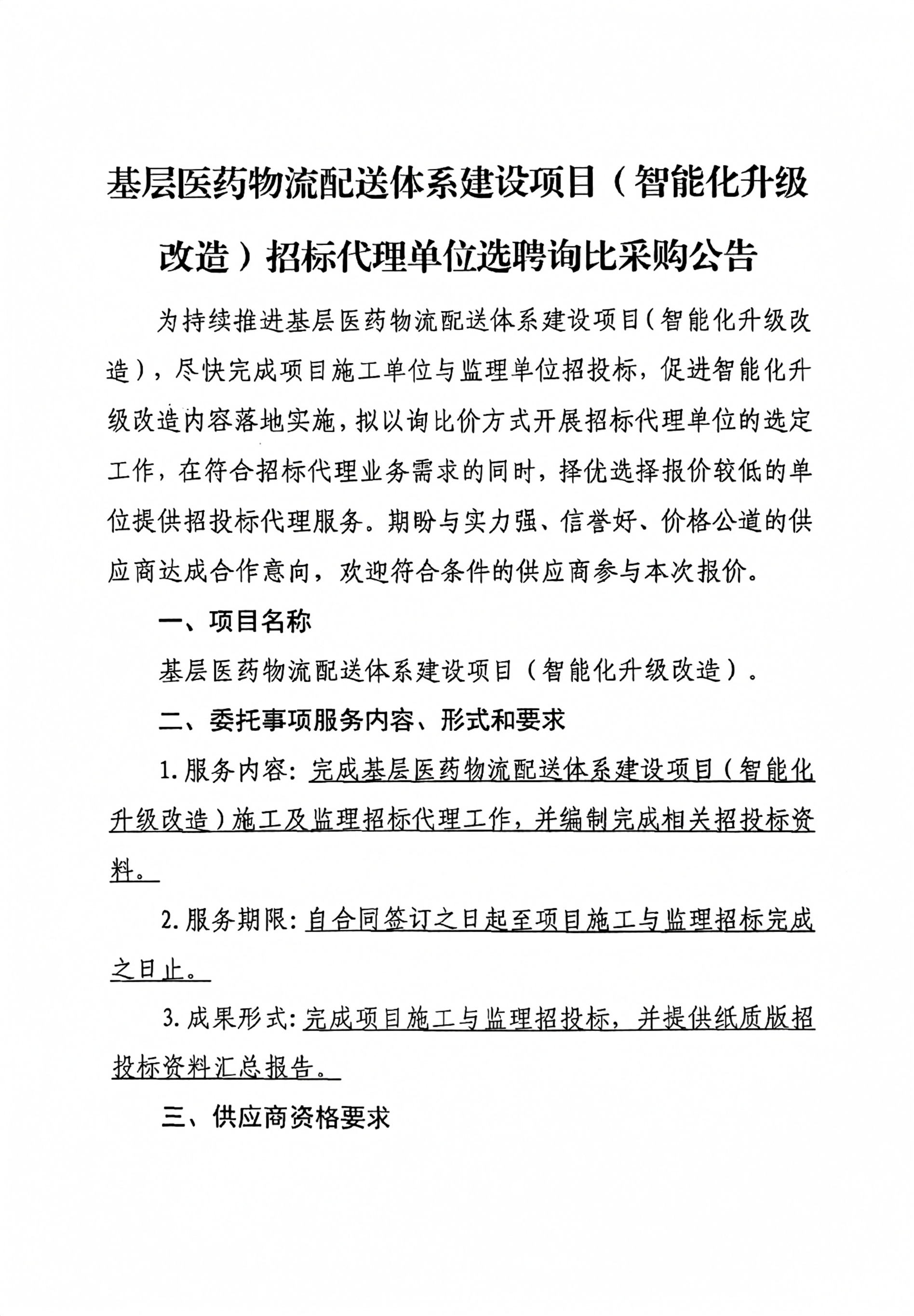 基層醫(yī)藥物流配送體系建設(shè)項(xiàng)目(智能化升級(jí)改造)招標(biāo)代理單位選聘詢比采購(gòu)公告