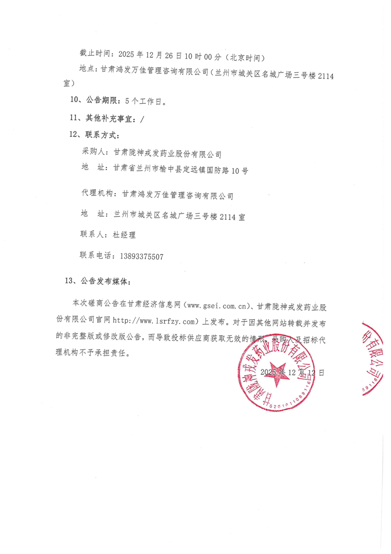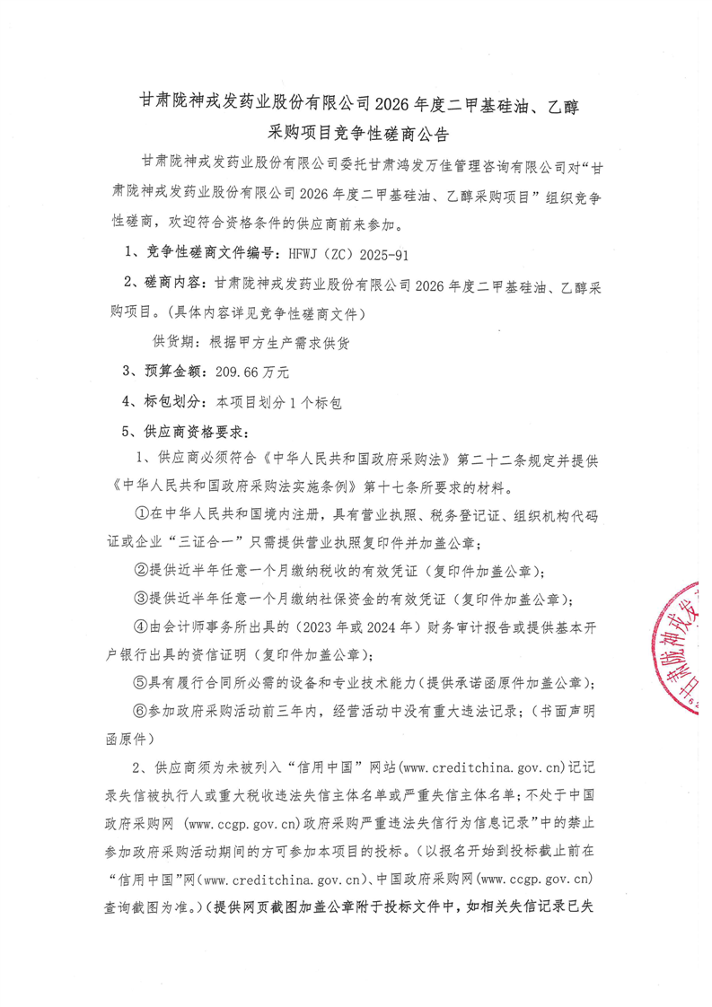 甘肅隴神戎發(fā)藥業(yè)股份有限公司2026年度二甲基硅油、乙醇采購項目競爭性磋商公告