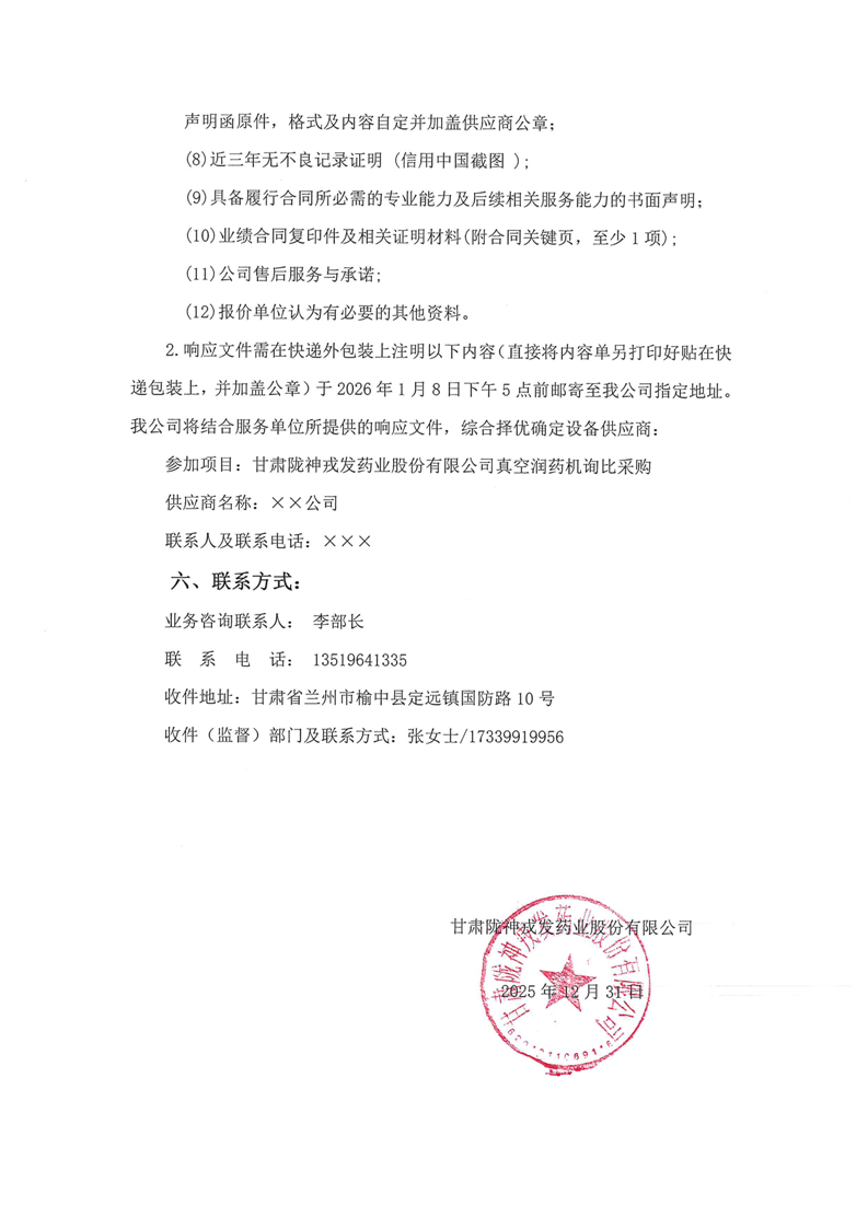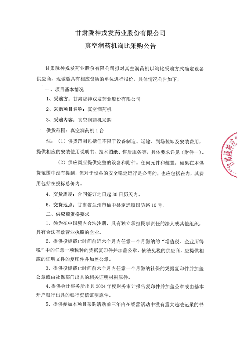 甘肅隴神戎發(fā)藥業(yè)股份有限公司真空潤藥機(jī)詢比采購公告