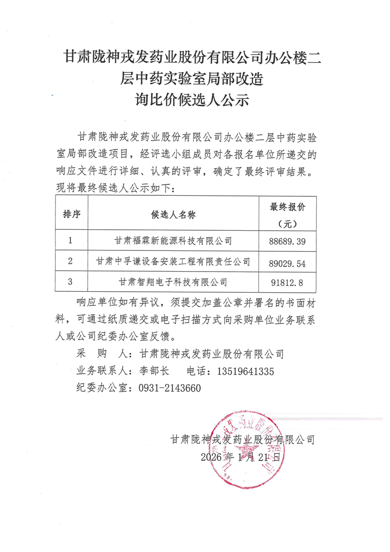 甘肅隴神戎發(fā)藥業(yè)股份有限公司辦公樓二層中藥實驗室局部改造詢比價候選人公示