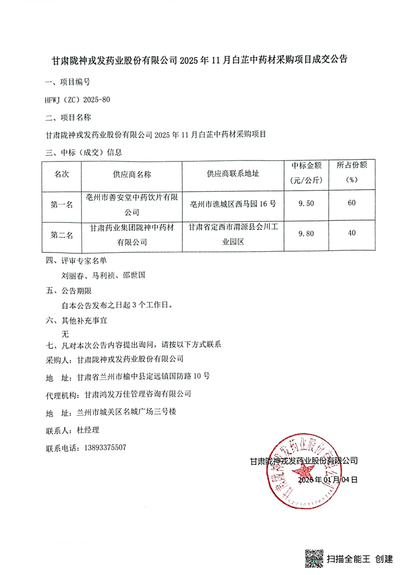 甘肅隴神戎發(fā)藥業(yè)股份有限公司2025年11月白芷中藥材采購項目成交公告