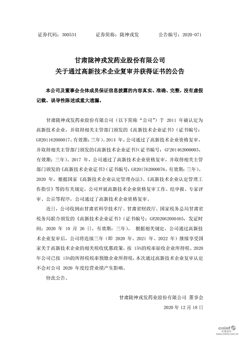 關于通過高新技術企業(yè)復審并獲得證書的公告