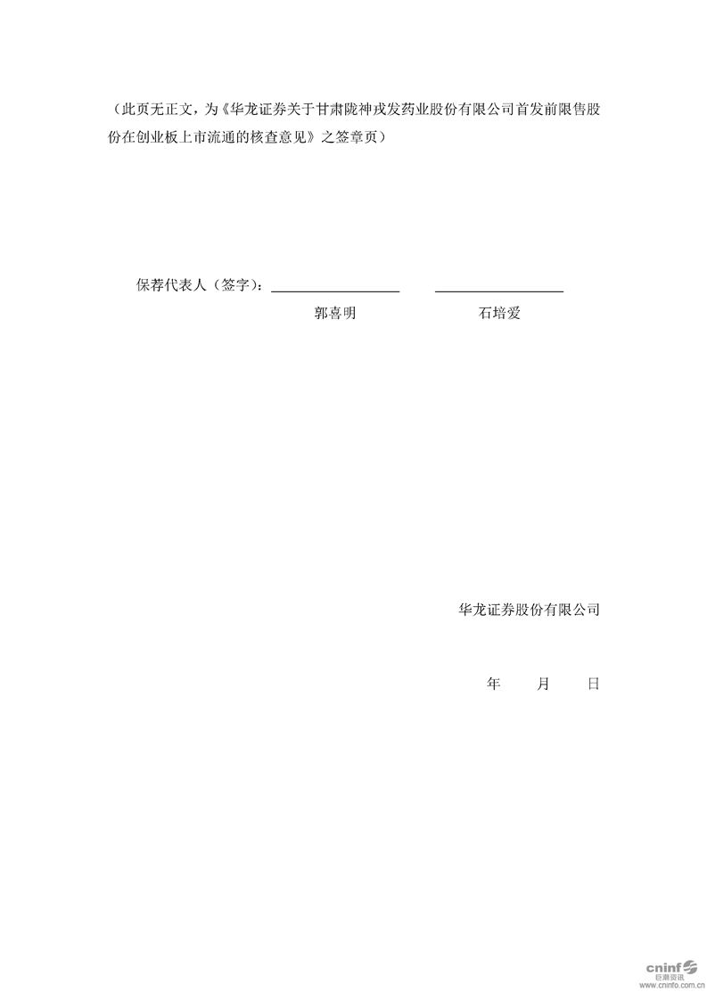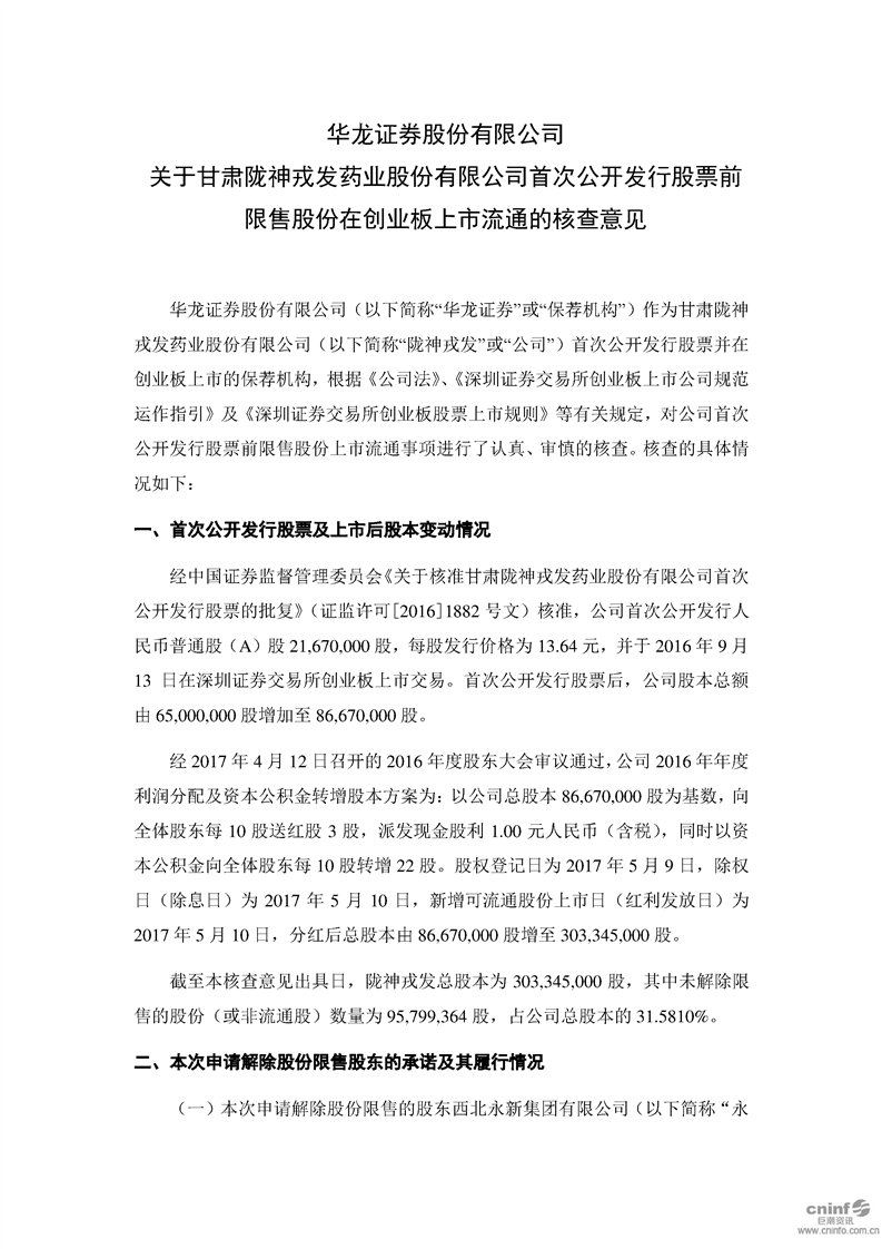 華龍證券股份有限公司關于公司首次公開發(fā)行股票前限售股份在創(chuàng)業(yè)板上市流通的核查意見