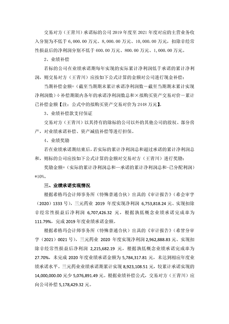 控股子公司2020年度業(yè)績(jī)承諾完成情況的專項(xiàng)報(bào)告