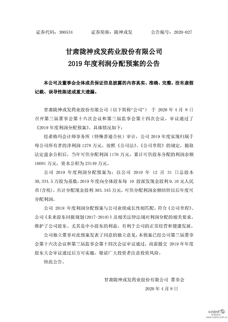 2019年度利潤分配預(yù)案的公告