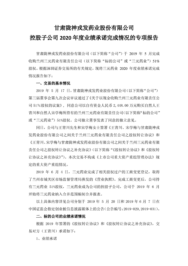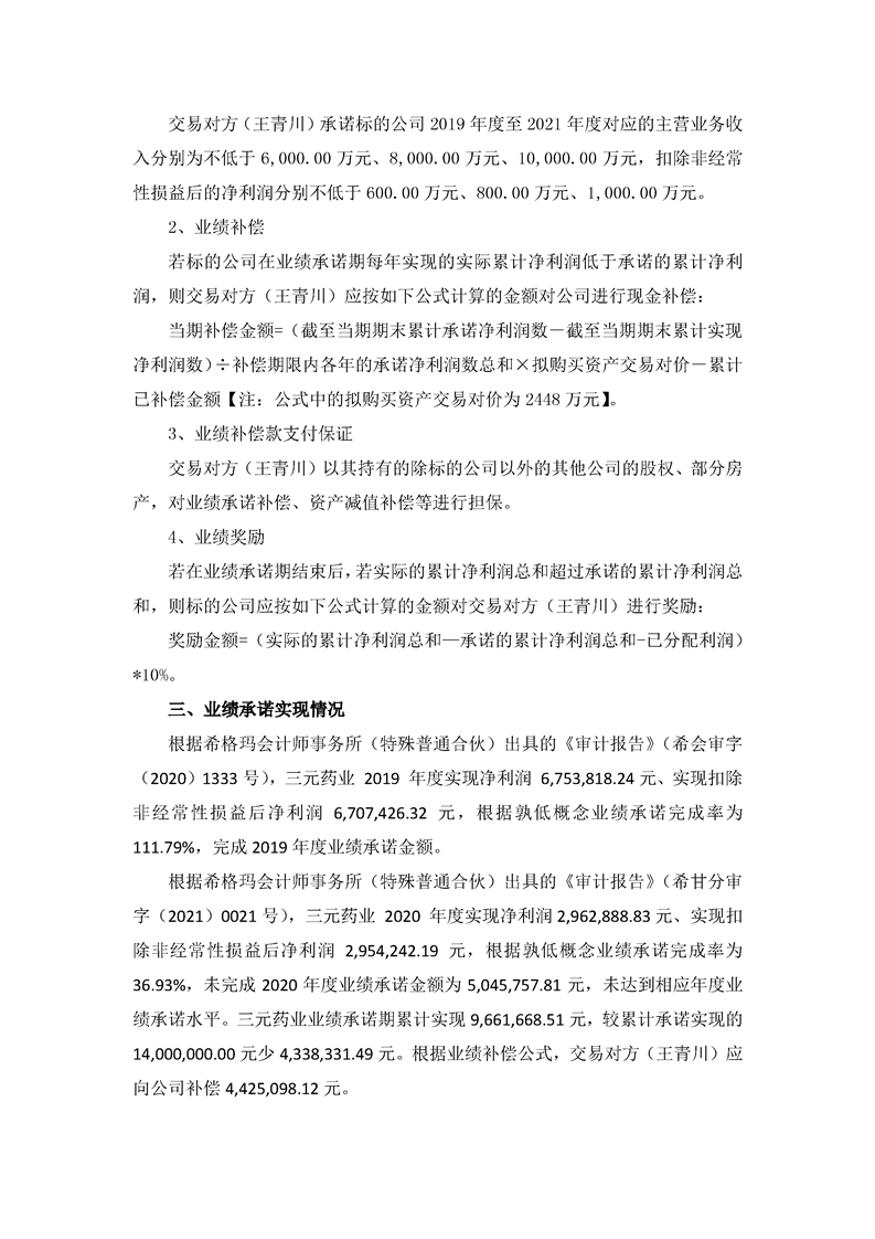 控股子公司2020年度業(yè)績承諾完成情況的專項報告(更新后)
