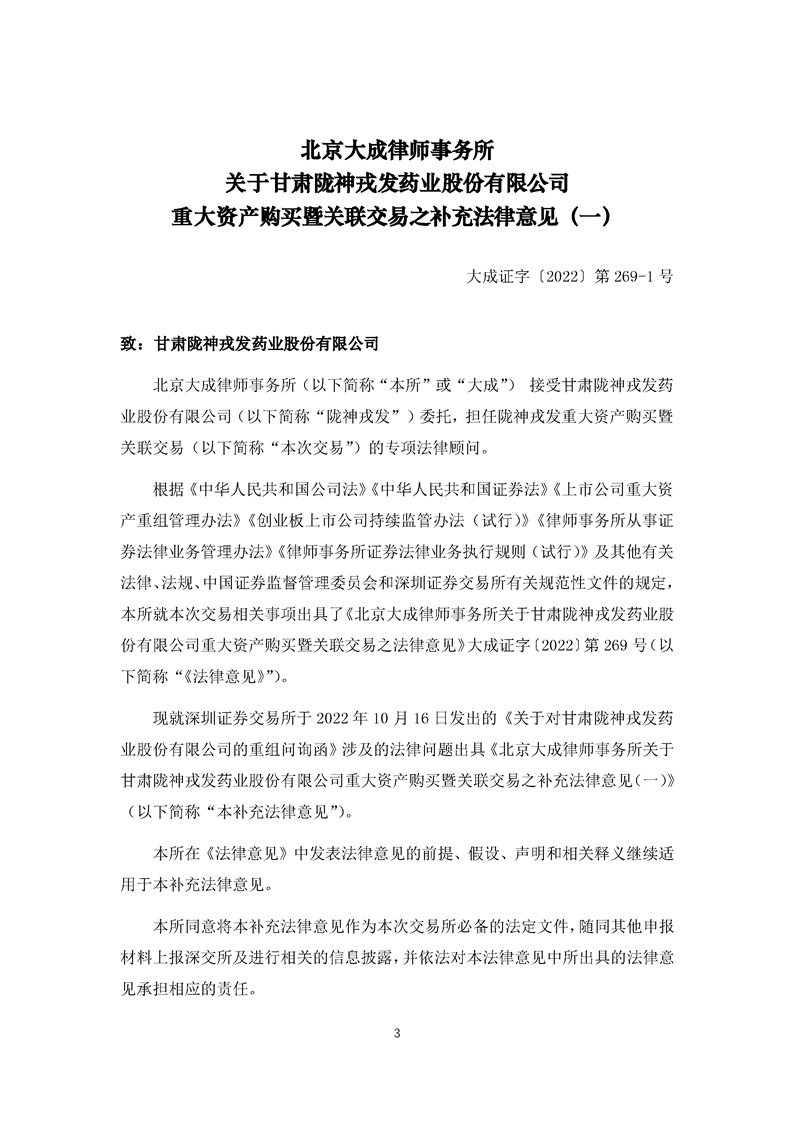 北京大成律師事務所關于甘肅隴神戎發(fā)藥業(yè)股份有限公司重大資產(chǎn)購買暨關聯(lián)交易補充法律意見(一)