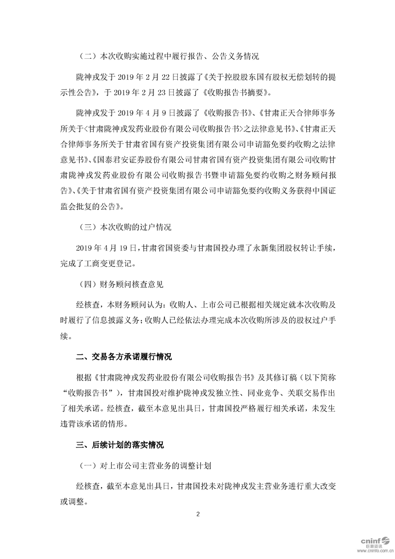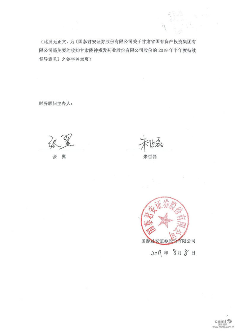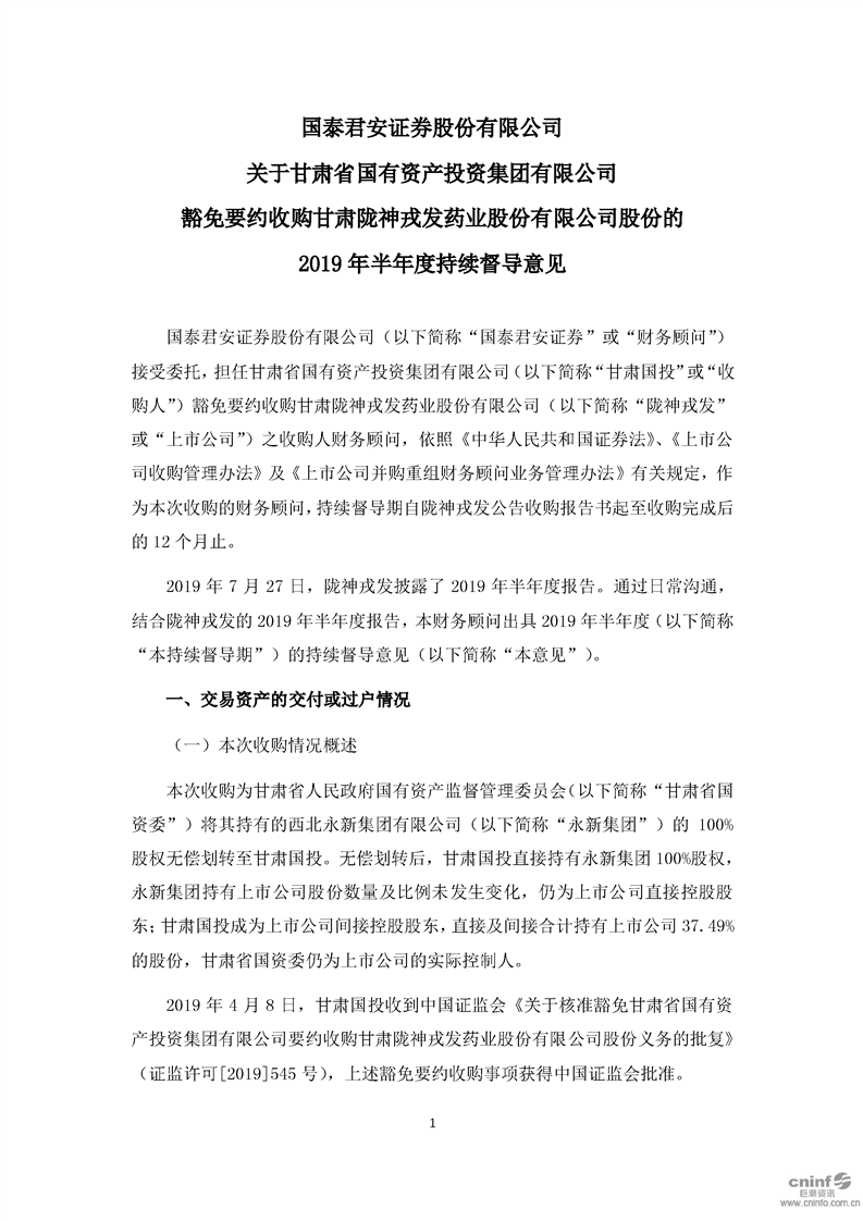 國泰君安證券股份有限公司關(guān)于甘肅省國有資產(chǎn)投資集團有限公司豁免要約收購公司股份的2019年半年度持續(xù)督導(dǎo)意見