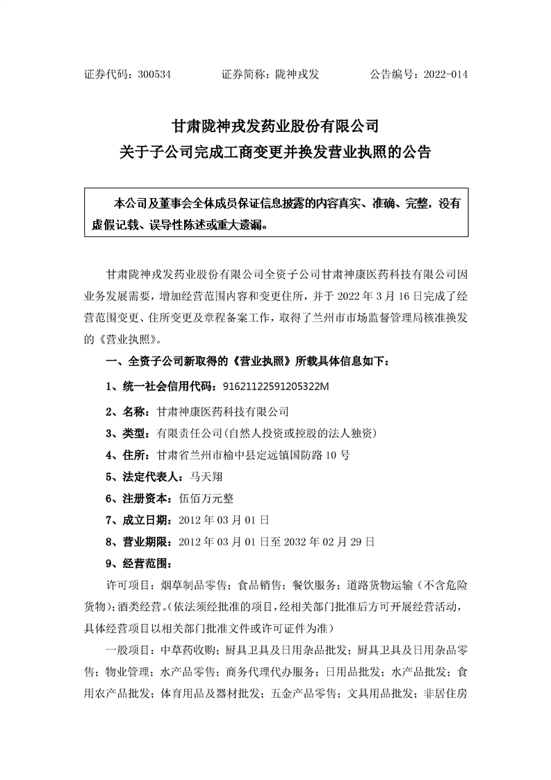 關(guān)于子公司完成工商變更并換發(fā)營(yíng)業(yè)執(zhí)照的公告