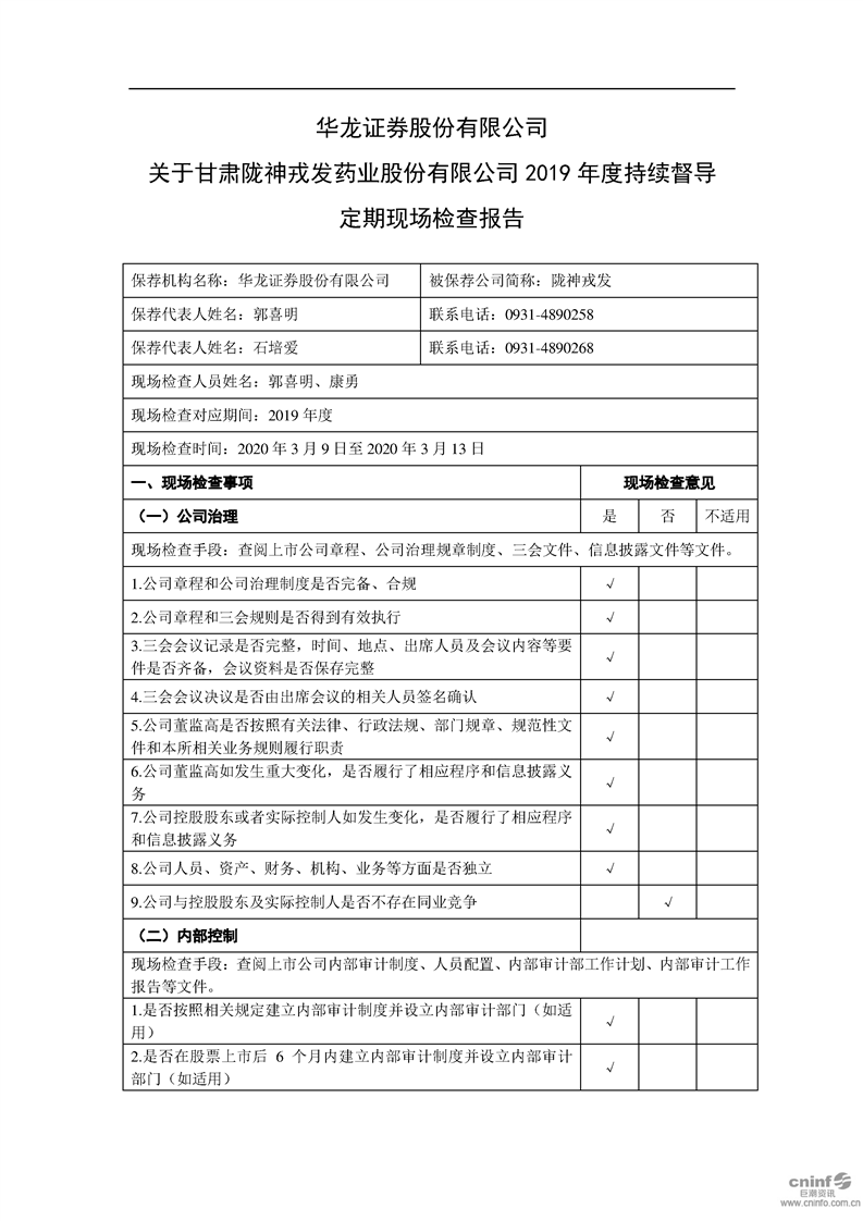 華龍證券股份有限公司關(guān)于公司2019年度持續(xù)督導定期現(xiàn)場檢查報告