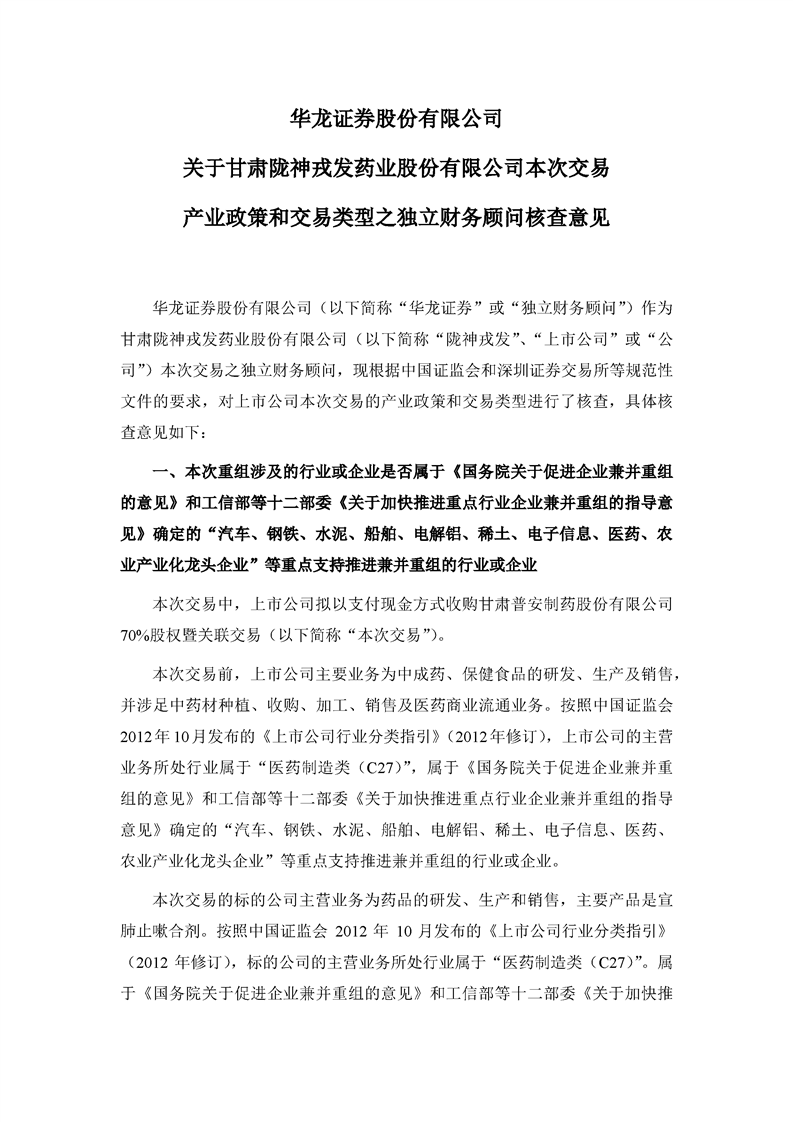 華龍證券股份有限公司關(guān)于甘肅隴神戎發(fā)藥業(yè)股份有限公司本次交易產(chǎn)業(yè)政策和交易類型之獨(dú)立財務(wù)顧問核查意見