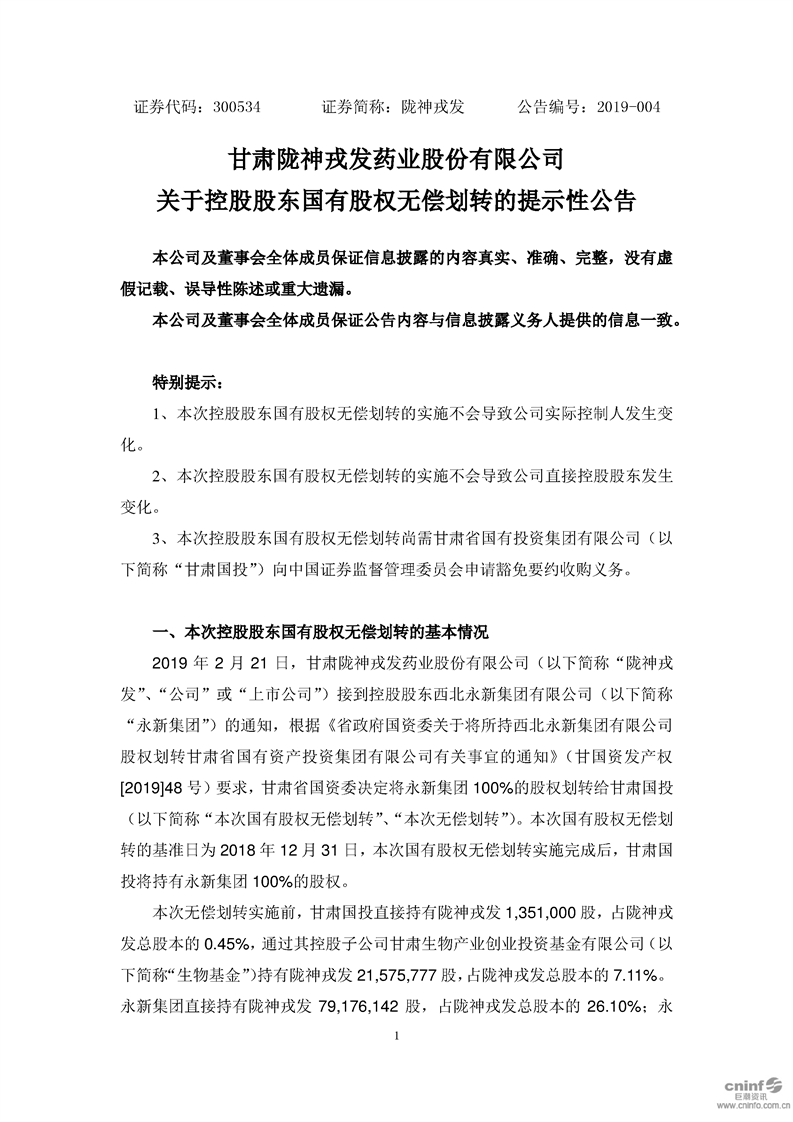 關(guān)于控股股東國(guó)有股權(quán)無(wú)償劃轉(zhuǎn)的提示性公告