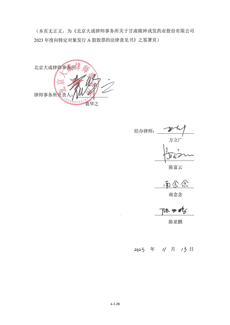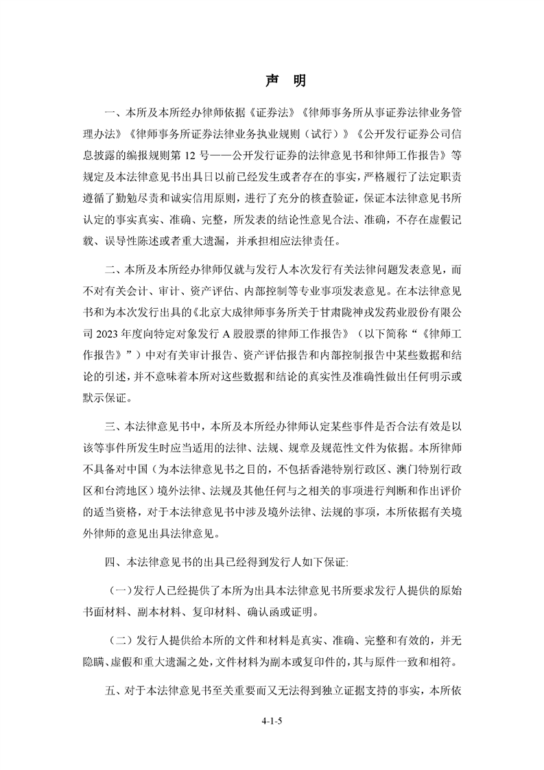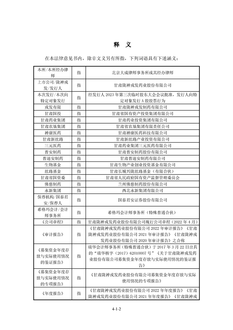 北京大成律師事務(wù)所關(guān)于甘肅隴神戎發(fā)藥業(yè)股份有限公司2023年度向特定對(duì)象發(fā)行A股股票的法律意見書