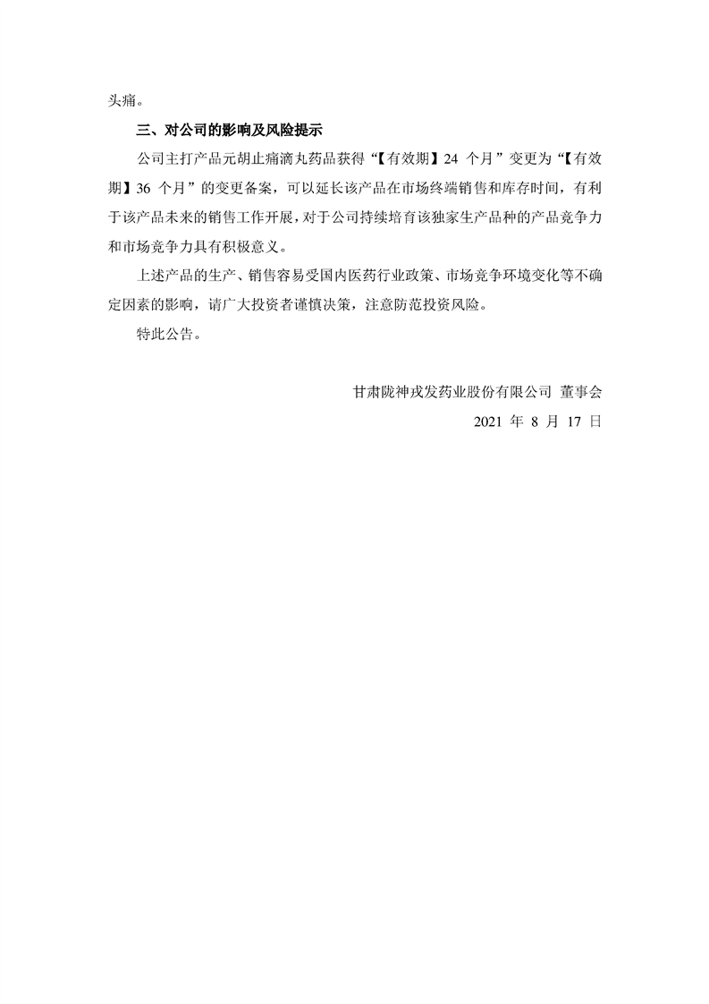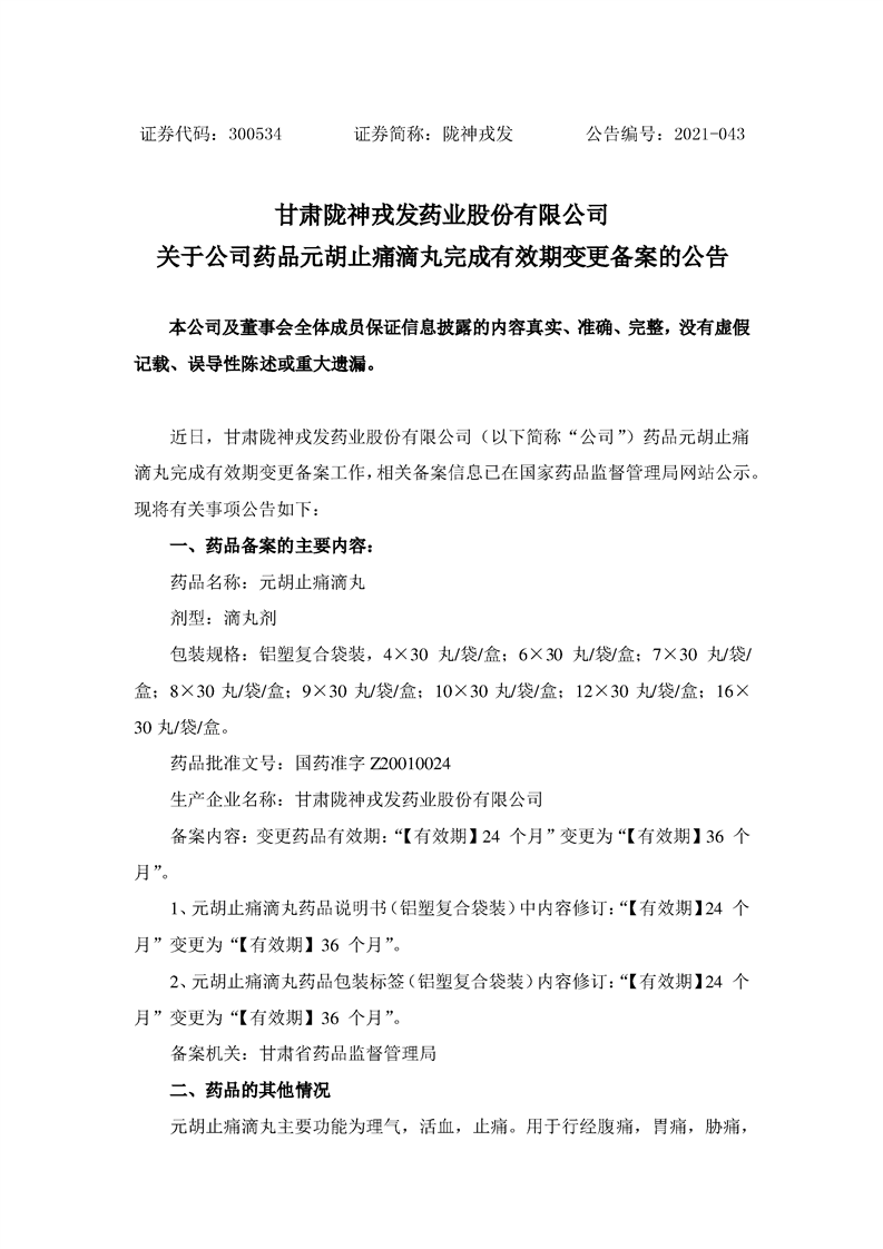關(guān)于公司藥品元胡止痛滴丸完成有效期變更備案的公告
