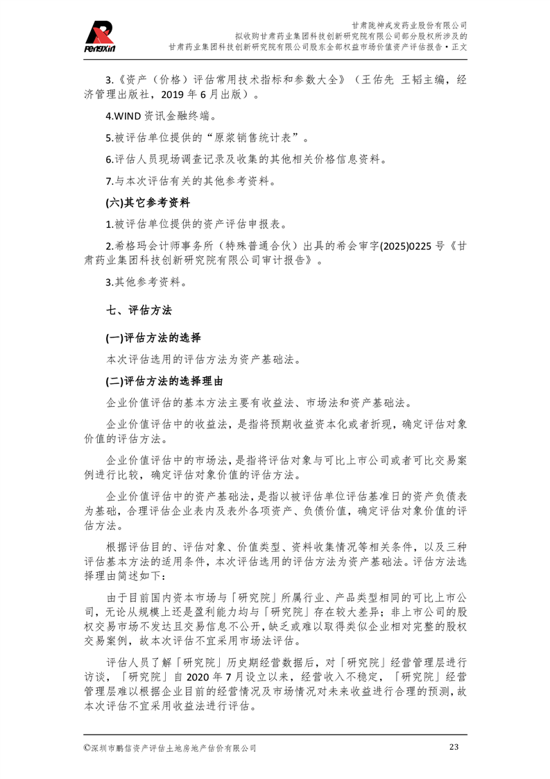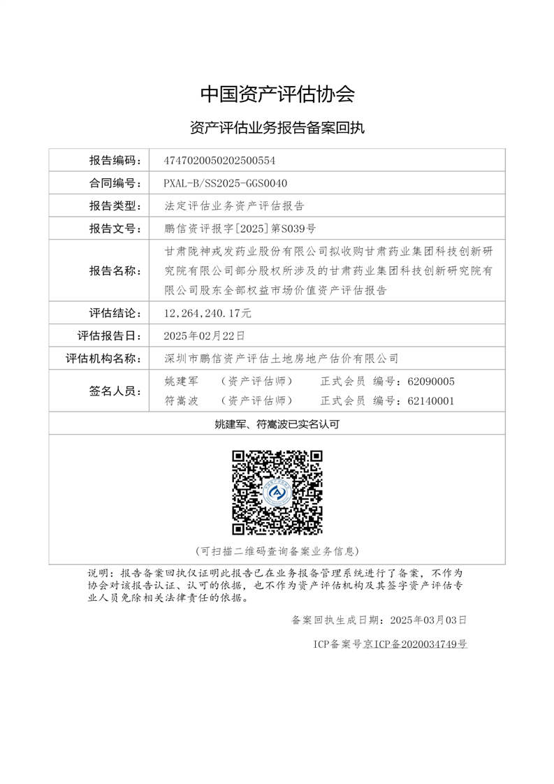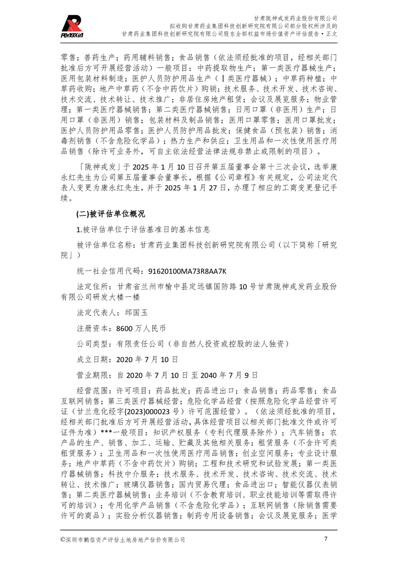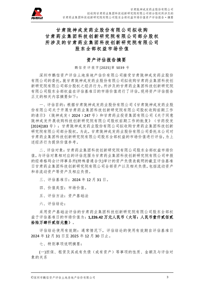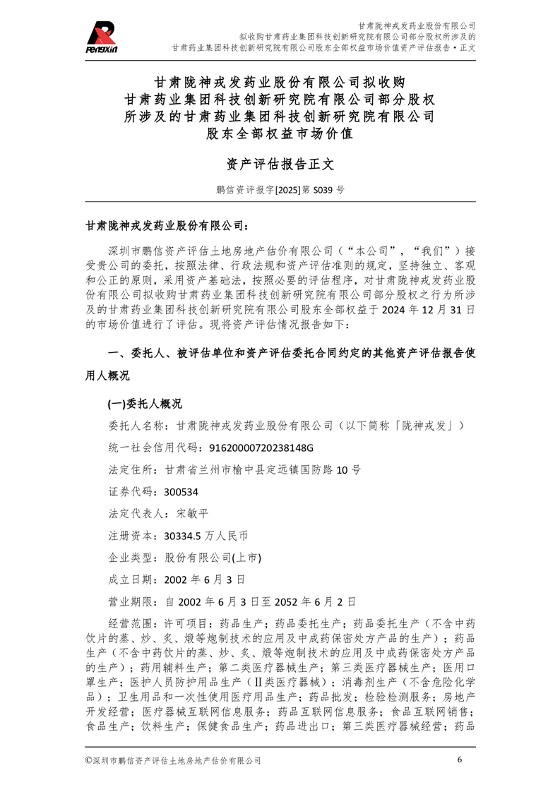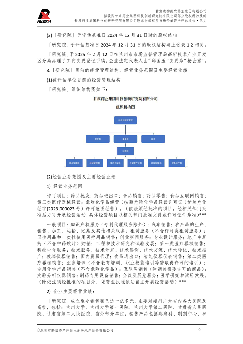 甘肅藥業(yè)集團科技創(chuàng)新研究院有限公司股東全部權(quán)益市場價值資產(chǎn)評估報告(鵬信資評報字[2025]第S039號)