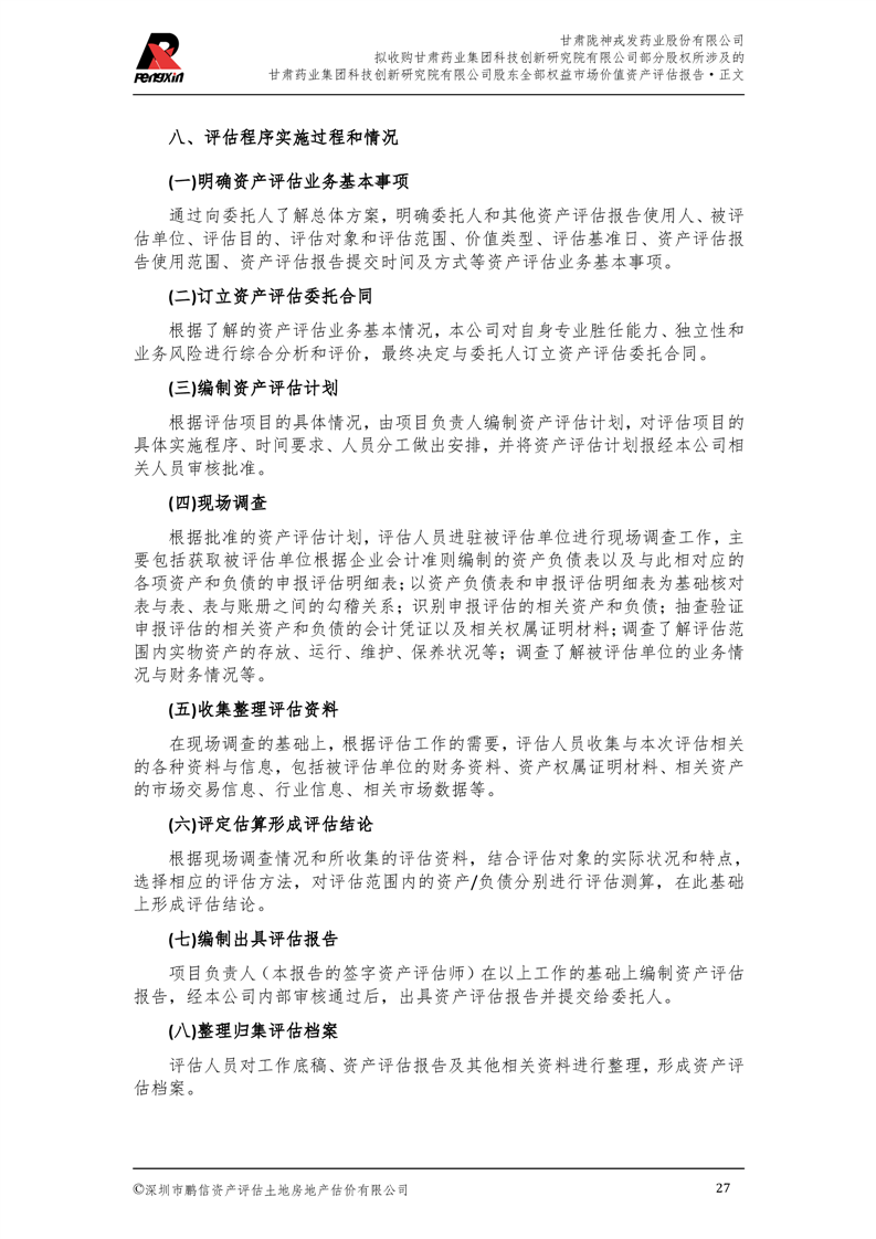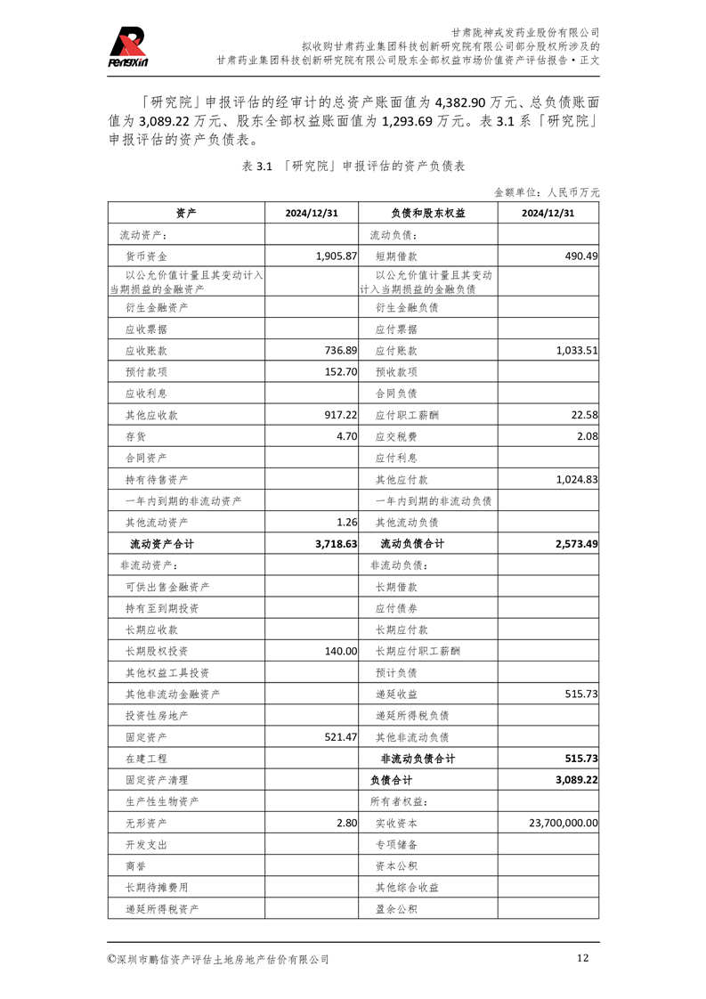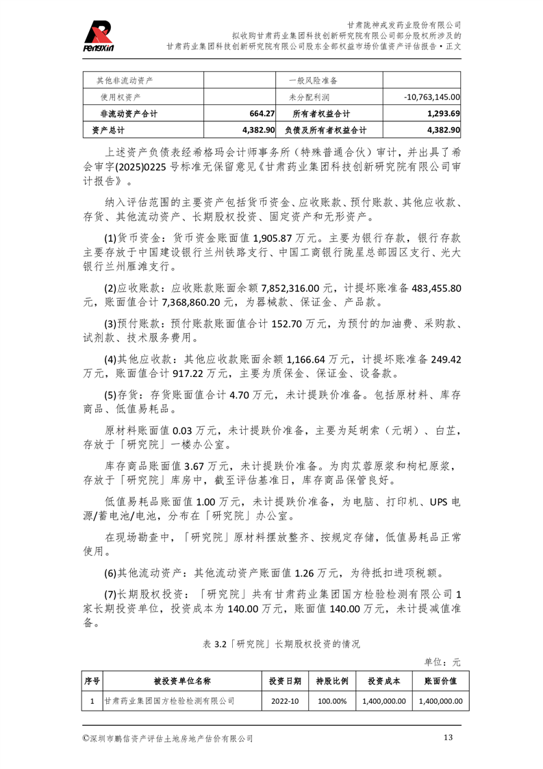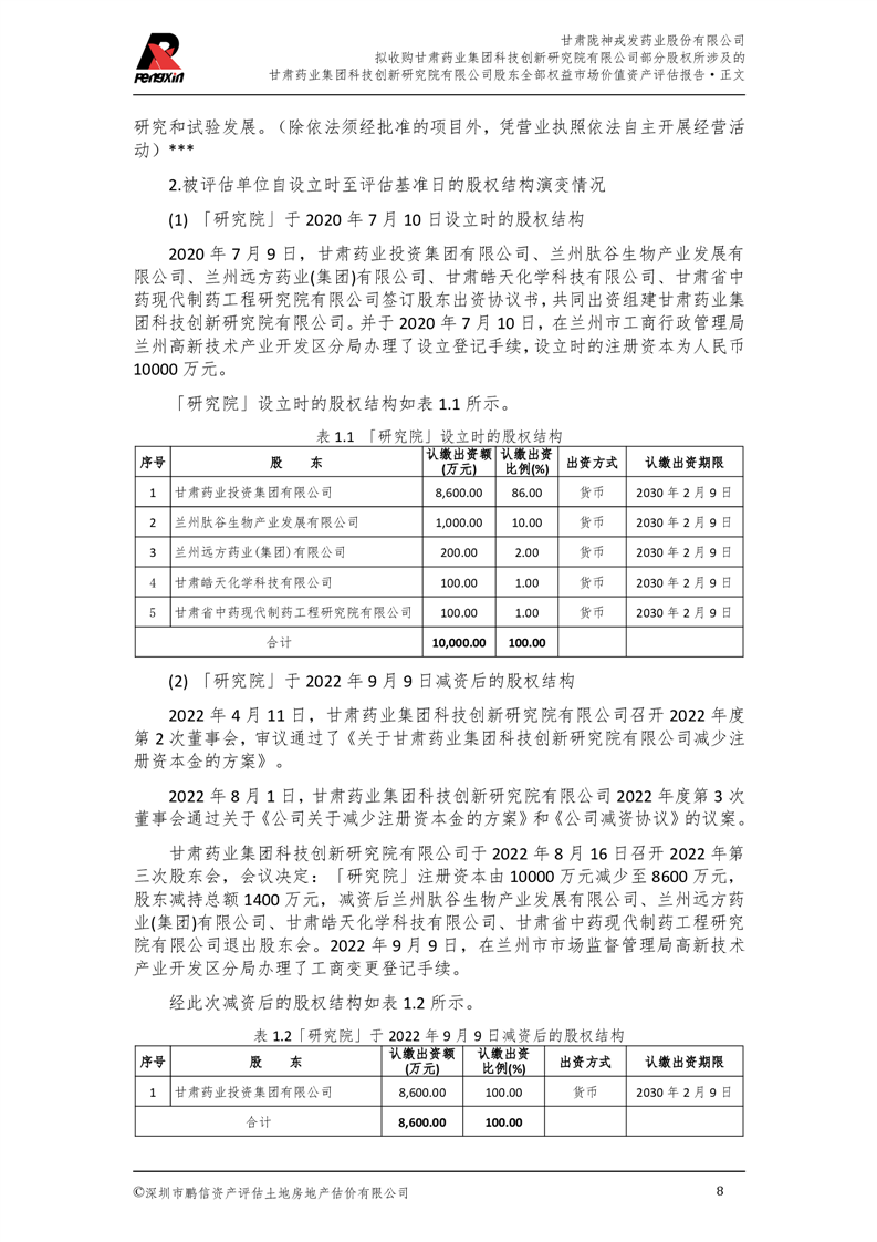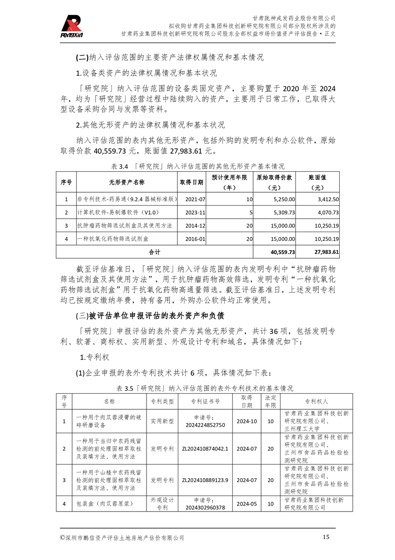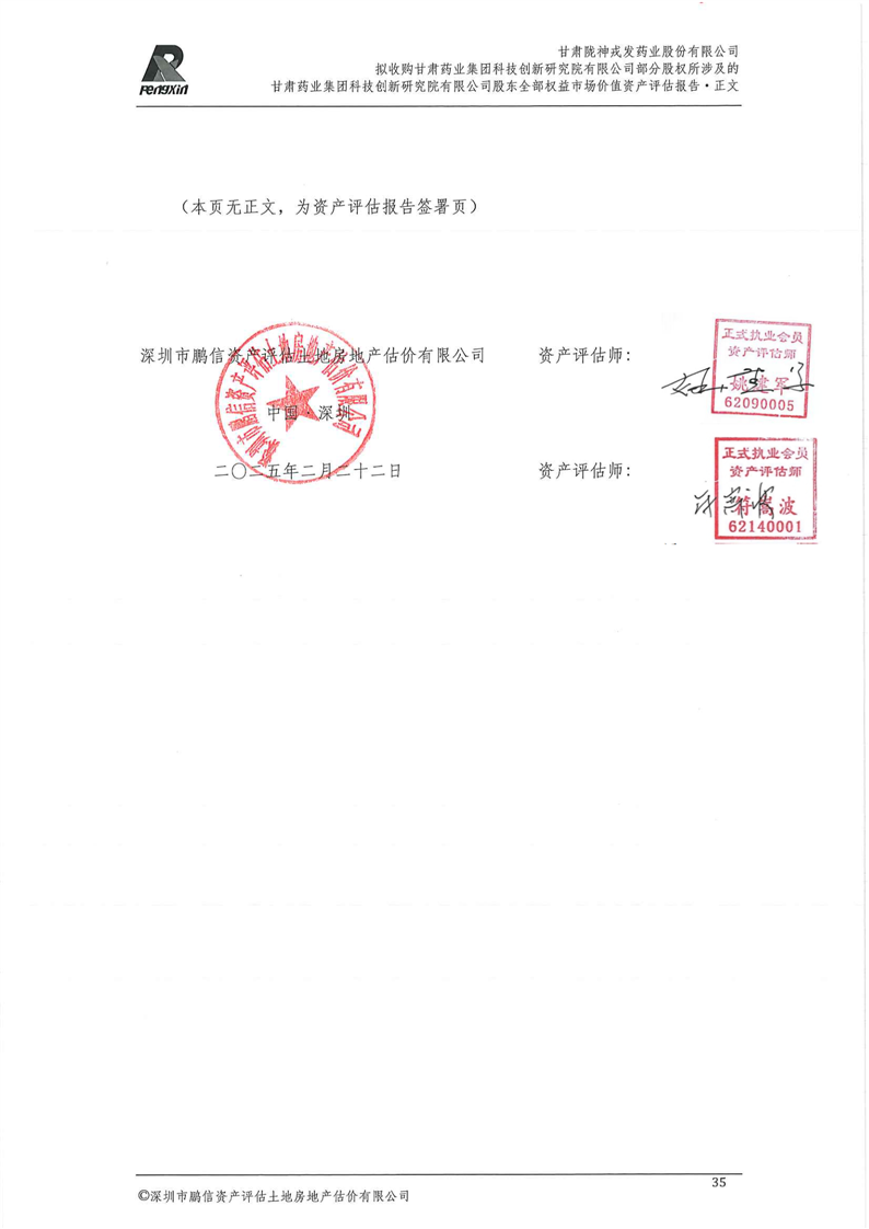 甘肅藥業(yè)集團科技創(chuàng)新研究院有限公司股東全部權(quán)益市場價值資產(chǎn)評估報告(鵬信資評報字[2025]第S039號)