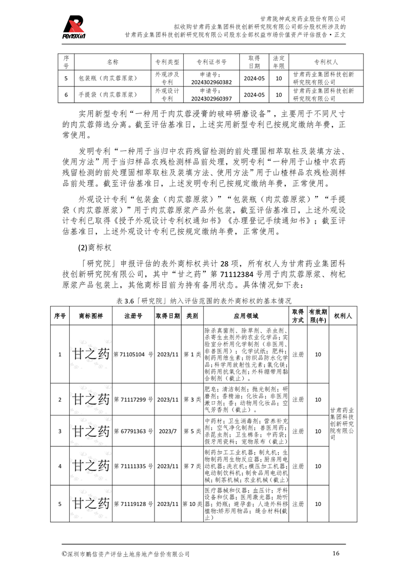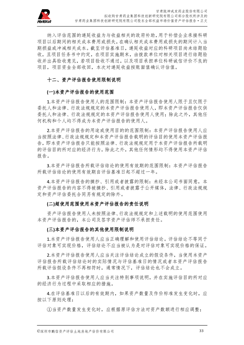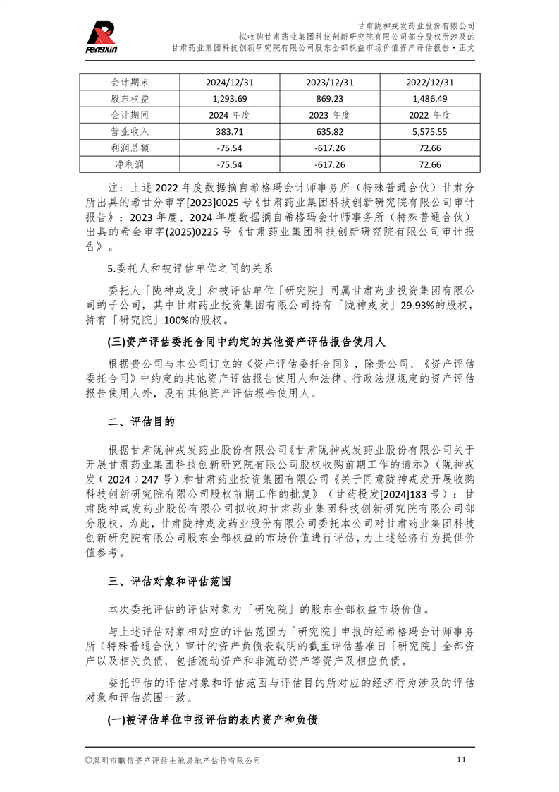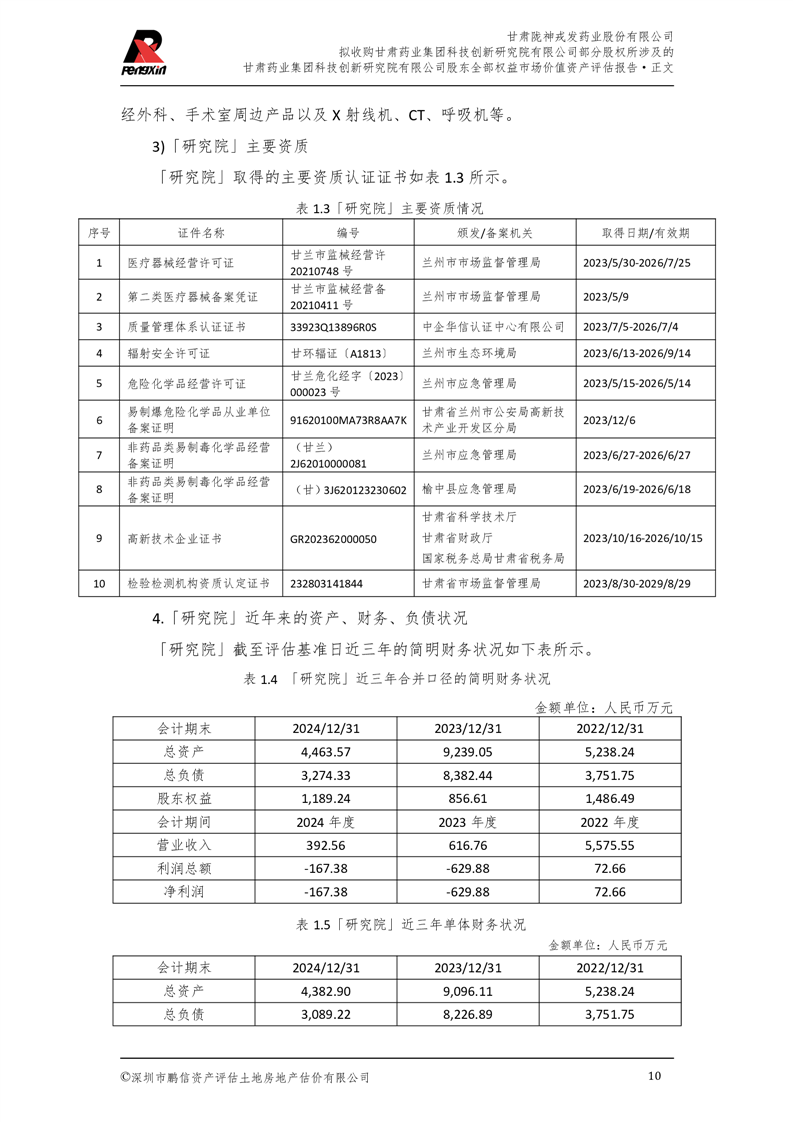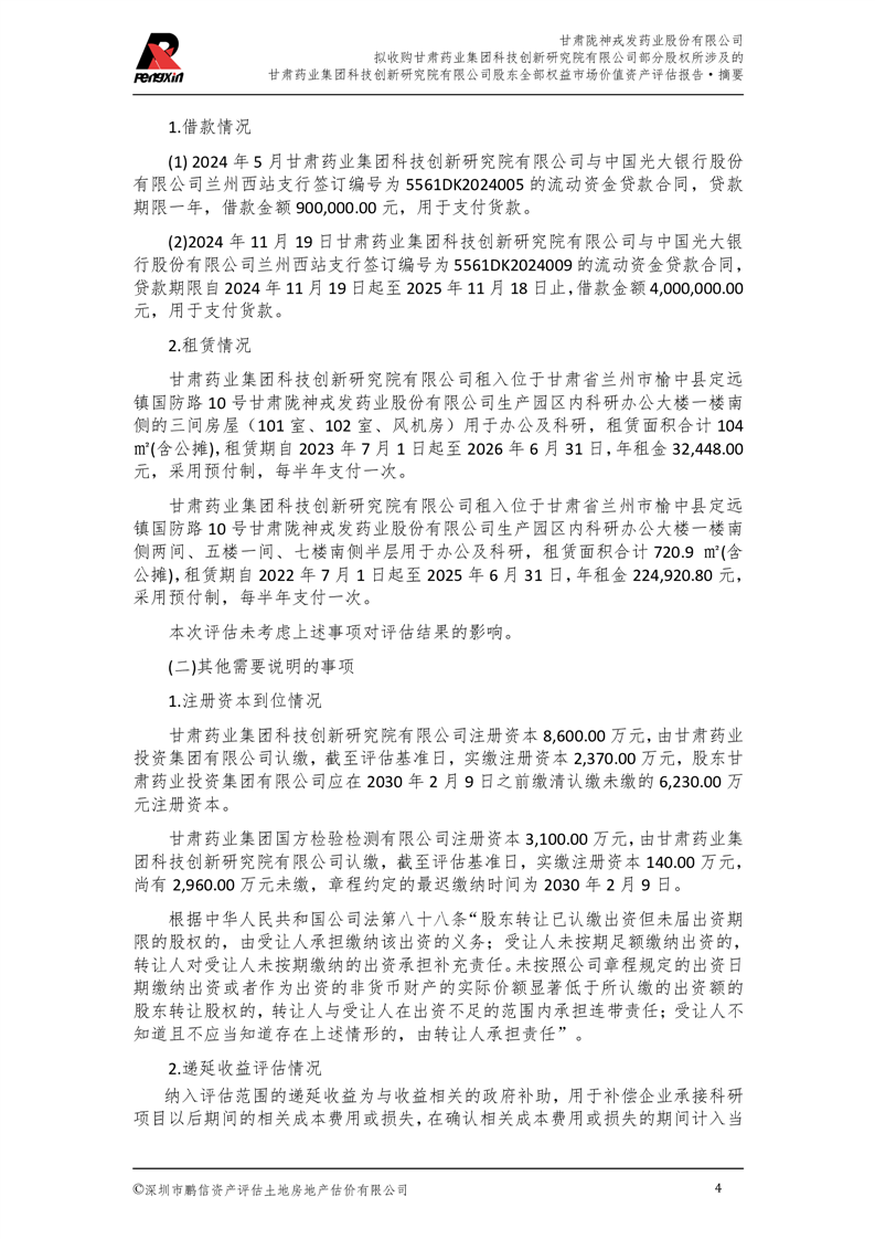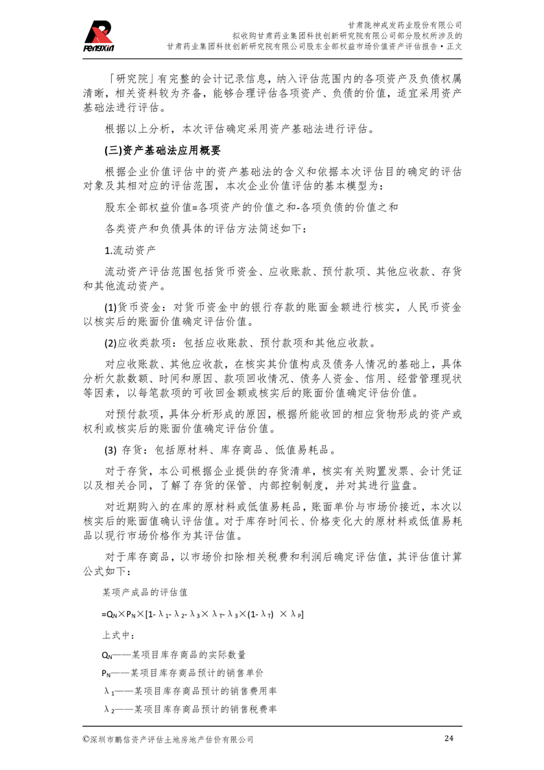 甘肅藥業(yè)集團科技創(chuàng)新研究院有限公司股東全部權(quán)益市場價值資產(chǎn)評估報告(鵬信資評報字[2025]第S039號)