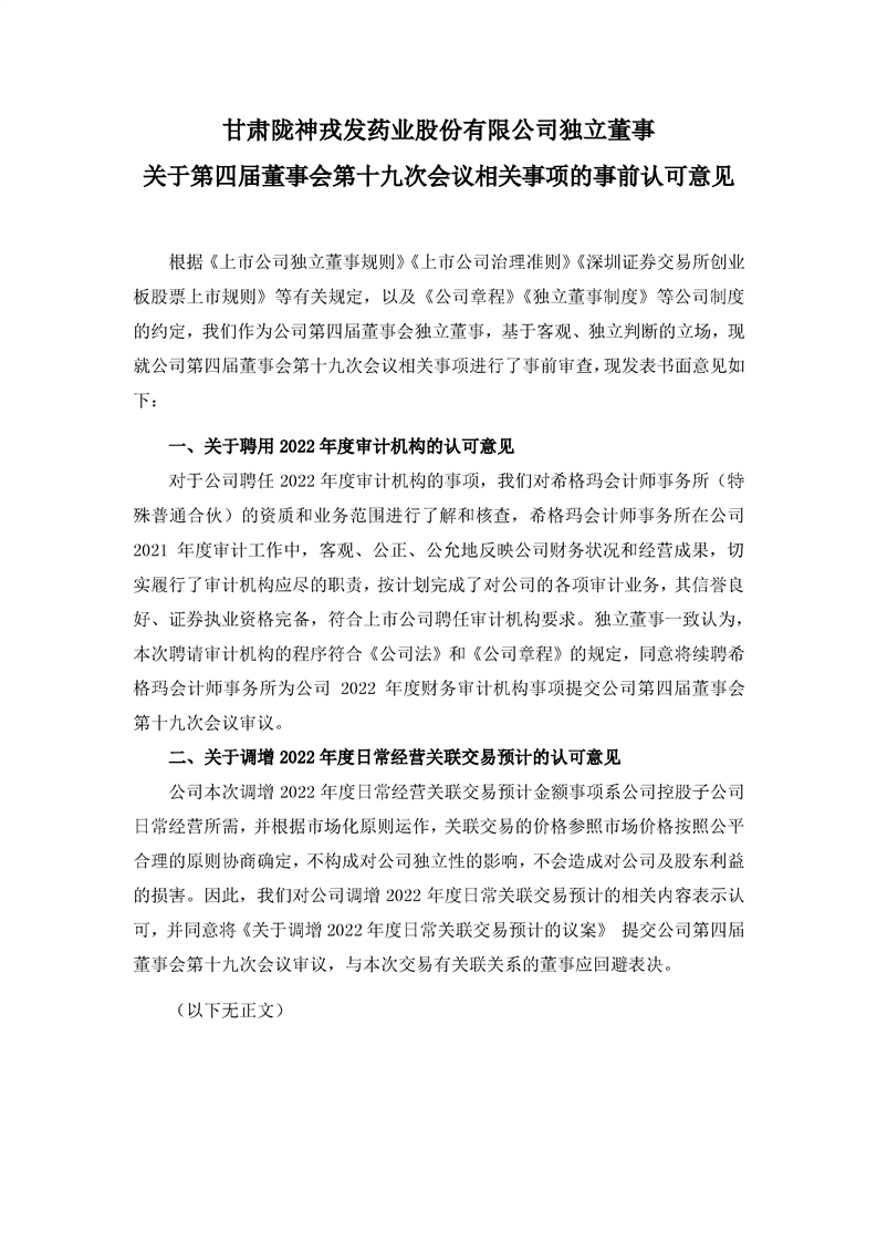 獨立董事關(guān)于第四屆董事會第十九次會議相關(guān)事項的事前認可意見