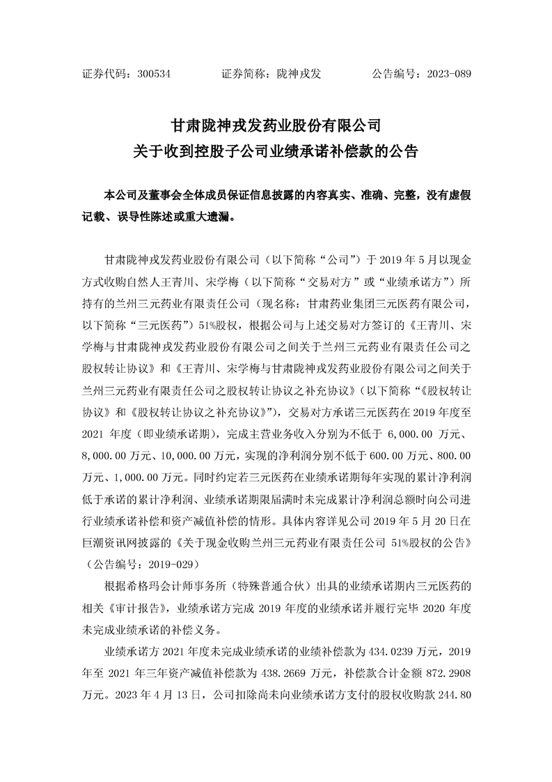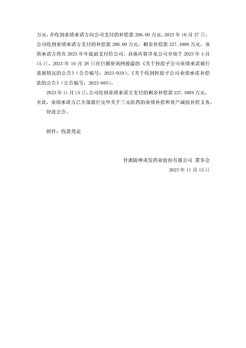 關(guān)于收到控股子公司業(yè)績承諾補(bǔ)償款的公告