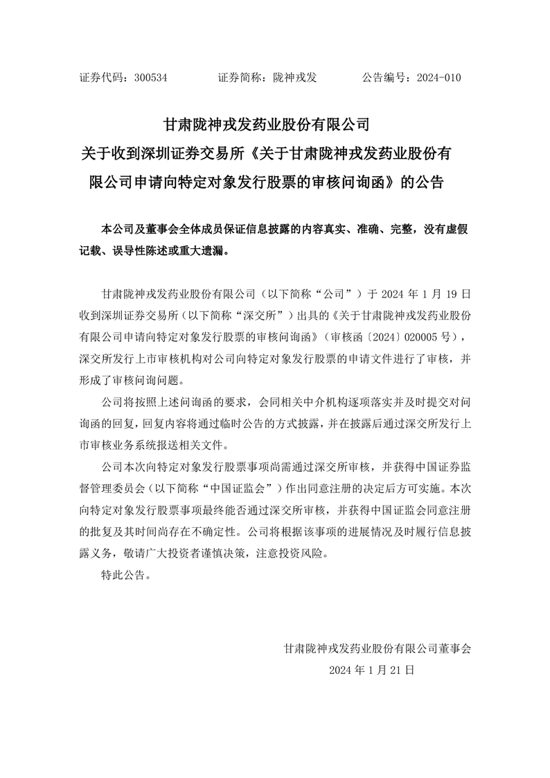 關(guān)于收到深圳證券交易所《關(guān)于甘肅隴神戎發(fā)藥業(yè)股份有限公司申請向特定對象發(fā)行股票的審核問詢函》的公告