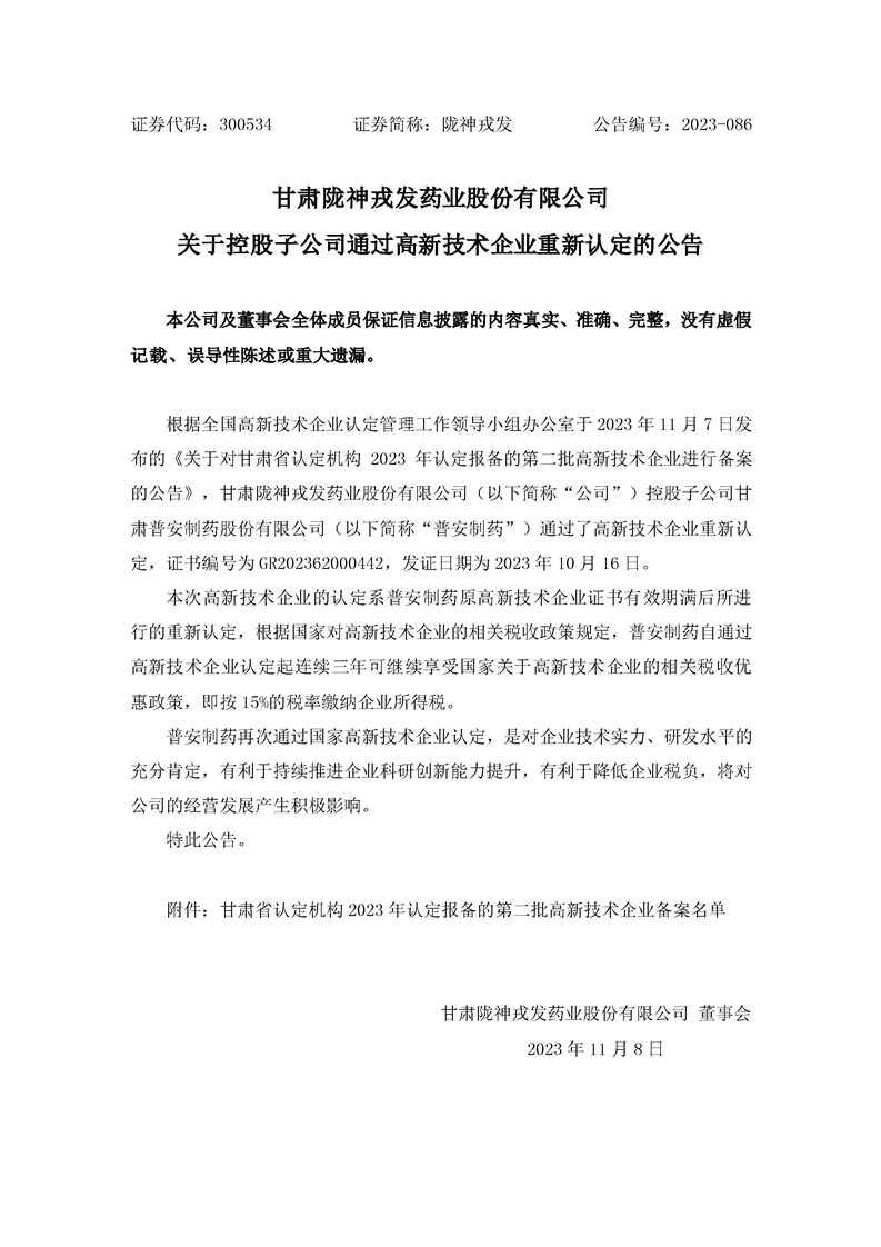 關于控股子公司通過高新技術企業(yè)重新認定的公告