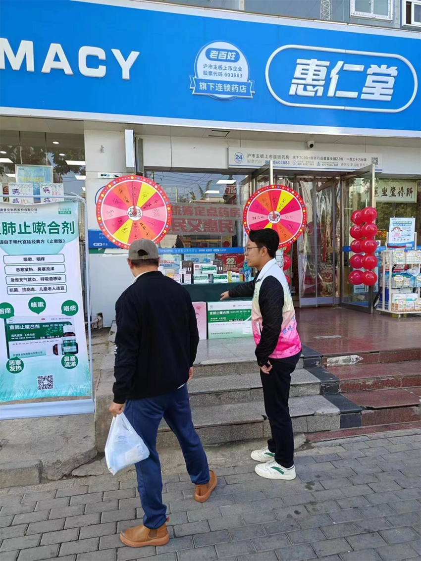 活動期間,學術部及三元醫(yī)藥OTC部的各位同事分工協(xié)作,在各藥房門口放置藥品展示臺,來往行人顧客紛紛停下腳步,表示想轉一轉我們的愛心“大轉盤”,參加小游戲,學習中醫(yī)藥小知識。