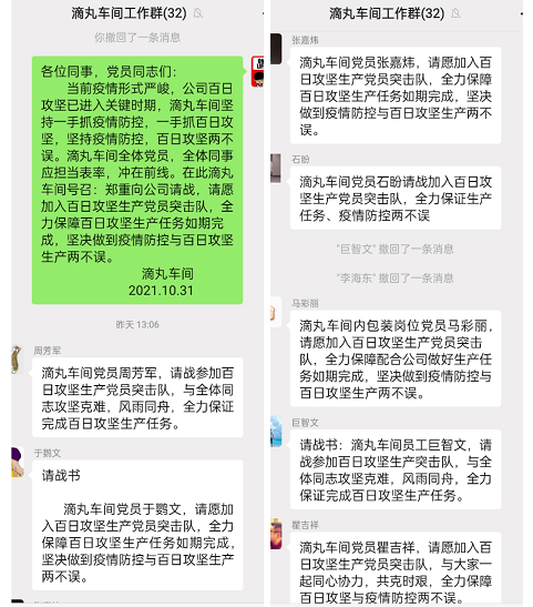 公司加快推進黨建融入重大項目建設、融入生產、科技、營銷攻堅行動,在重點項目和重大工作任務現(xiàn)場開展“亮身份、樹形象、做表率”活動,黨員身份公開化、監(jiān)督制度化、作用最大化,黨員主動亮身份,一名黨員一面旗,進一步提升黨員身份意識、責任意識和先鋒模范意識,不斷增強黨支部的號召力、凝聚力和戰(zhàn)斗力。2021年10月,隴神戎發(fā)成立了 “黨旗為引領、圓夢隴藥”沖刺行動黨員突擊隊。在25名黨員干部帶領下,全體干部職工齊心協(xié)力,確保疫情防控和生產保障“兩手抓”、“兩不誤”。
