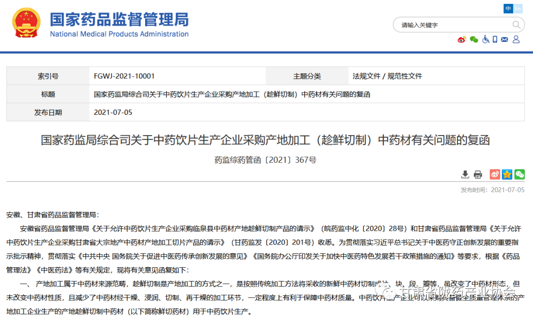 2021年6月,國家藥監(jiān)局印發(fā)《關(guān)于中藥飲片生產(chǎn)企業(yè)采購產(chǎn)地加工(趁鮮切制)中藥材有關(guān)問題的復(fù)函》(藥監(jiān)綜藥管函【2021】367號),允許全國中藥飲片生產(chǎn)企業(yè)可以采購甘肅省全省和安徽省臨泉縣一個縣、符合條件的產(chǎn)地加工企業(yè)生產(chǎn)的產(chǎn)地趁鮮切制中藥材,用于中藥飲片生產(chǎn),為甘肅中藥材產(chǎn)地加工高質(zhì)量發(fā)展帶來重大政策支撐。省藥監(jiān)局等10廳局聯(lián)合印發(fā)《甘肅省大宗地產(chǎn)中藥材產(chǎn)地加工(趁鮮切制)工作方案》(甘藥監(jiān)發(fā)【2021】149號),公布了黃芪、黨參、當(dāng)歸、甘草、大黃、板藍(lán)根、紅芪首批7個試點品種。隴藥協(xié)會搶抓這一政策機(jī)遇,組織相關(guān)企業(yè)制定遠(yuǎn)高于現(xiàn)行《中國藥典》的行業(yè)標(biāo)準(zhǔn),引進(jìn)國際先進(jìn)加工技術(shù),生產(chǎn)高品質(zhì)當(dāng)歸、黃芪、黨參等大宗地產(chǎn)中藥材及飲片,引領(lǐng)帶動全省中藥材產(chǎn)地加工由傳統(tǒng)農(nóng)耕經(jīng)濟(jì)向標(biāo)準(zhǔn)化、工業(yè)化、數(shù)字化、全球化平臺經(jīng)濟(jì)轉(zhuǎn)型。