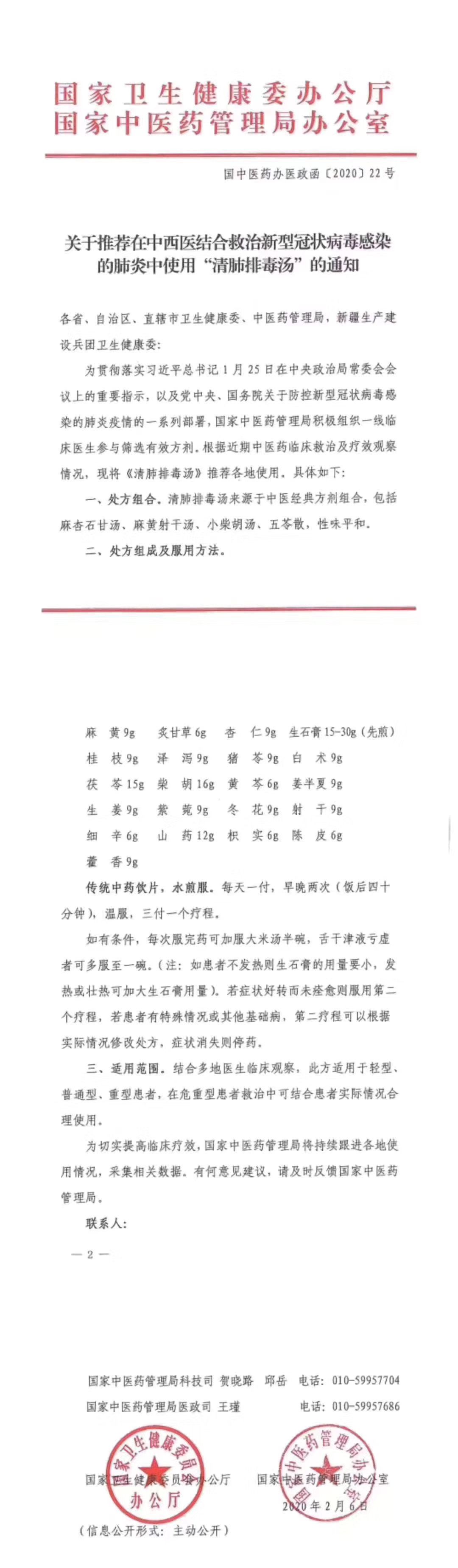 據(jù)統(tǒng)計,截至2月5日0時,4個試點省份運用清肺排毒湯救治確診病例214例,3天為一個療程,總有效率達(dá)90%以上,其中60%以上患者癥狀和影像學(xué)表現(xiàn)改善明顯,30%患者癥狀平穩(wěn)且無加重。