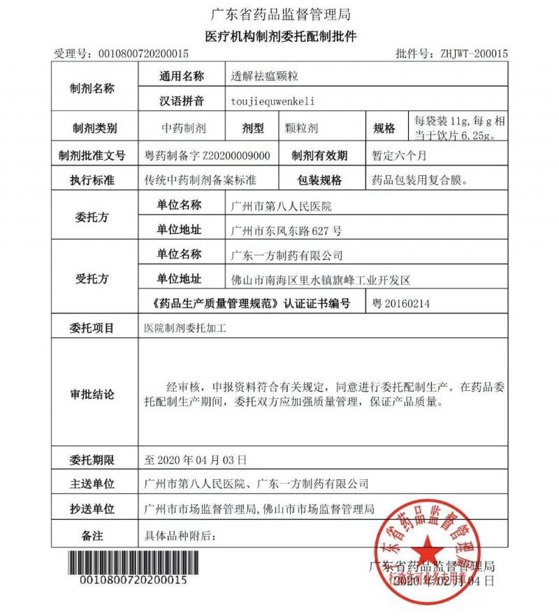 “肺炎一號方”制劑備案名稱為“透解祛瘟顆粒”,主治:疏風(fēng)透表、清熱解毒、益氣養(yǎng)陰,用于新型冠狀病毒感染的肺炎(輕癥)。