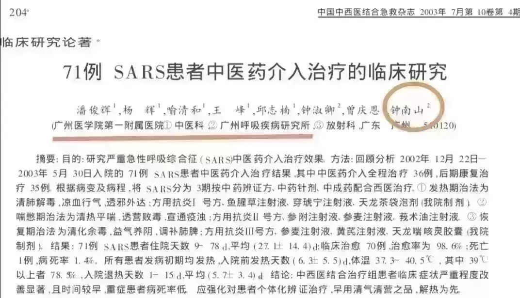 后來北京的小湯山醫(yī)院,使用中西醫(yī)結(jié)合治療680名非典病人,8人死亡,死亡率1.2%,基本達(dá)到了廣東中醫(yī)治療的水平。