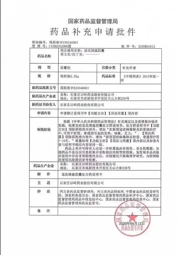 今天(4月14日),以嶺藥業(yè)發(fā)布午間公告稱:石家莊以嶺藥業(yè)股份有限公司和公司全資子公司北京以嶺藥業(yè)有限公司收到國家藥品監(jiān)督管理局下發(fā)的連花清瘟膠囊和連花清瘟顆粒的關于新增適應癥申請的《藥品補充申請批件》