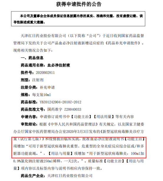 4月14日,紅日藥業(yè)發(fā)布公告稱,于近日收到國家藥品監(jiān)督管理局下發(fā)的關于血必凈注射液新增適應癥的《藥品補充申請批件》,【功能主治】項增加“可用于新型冠狀病毒肺炎重型、危重型的全身炎癥反應綜合征或/和多臟器功能衰竭?!?/span>